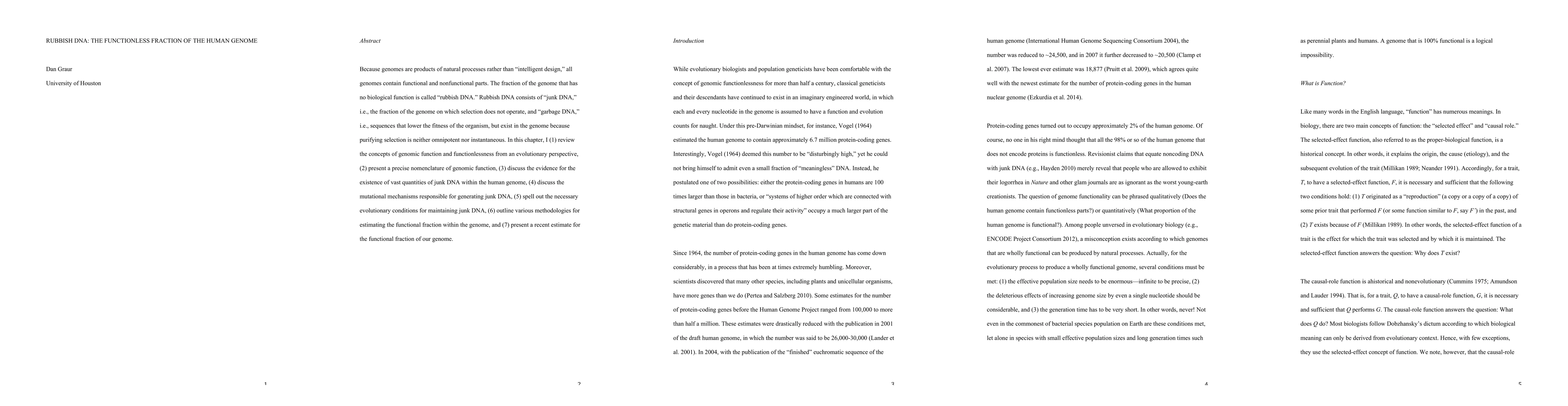 Because genomes are products of natural processes rather than intelligent design, all genomes contain functional and nonfunctional parts. The fraction of the genome that has no biological function is called rubbish DNA. Rubbish DNA consists of junk DNA, i.e., the fraction of the genome on which selection does not operate, and garbage DNA, i.e., sequences that lower the fitness of the organism, but exist in the genome because purifying selection is neither omnipotent nor instantaneous. In this chapter, I (1) review the concepts of genomic function and functionlessness from an evolutionary perspective, (2) present a precise nomenclature of genomic function, (3) discuss the evidence for the existence of vast quantities of junk DNA within the human genome, (4) discuss the mutational mechanisms responsible for generating junk DNA, (5) spell out the necessary evolutionary conditions for maintaining junk DNA, (6) outline various methodologies for estimating the functional fraction within the genome, and (7) present a recent estimate for the functional fraction of our genome.