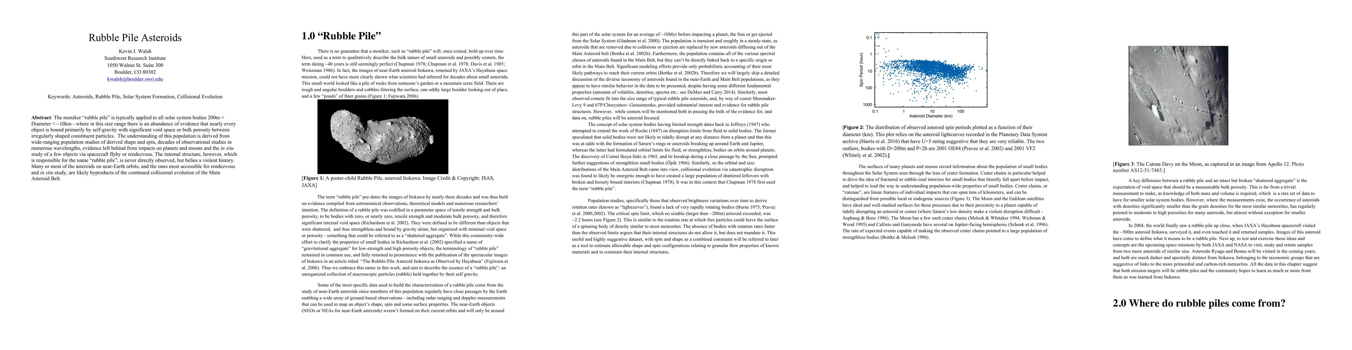 The moniker rubble pile is typically applied to all solar system bodies with Diameter between 200m and 10km - where in this size range there is an abundance of evidence that nearly every object is bound primarily by self-gravity with significant void space or bulk porosity between irregularly shaped constituent particles. The understanding of this population is derived from wide-ranging population studies of derived shape and spin, decades of observational studies in numerous wavelengths, evidence left behind from impacts on planets and moons and the in situ study of a few objects via spacecraft flyby or rendezvous. The internal structure, however, which is responsible for the name rubble pile, is never directly observed, but belies a violent history. Many or most of the asteroids on near-Earth orbits, and the ones most accessible for rendezvous and in situ study, are likely byproducts of the continued collisional evolution of the Main Asteroid Belt.