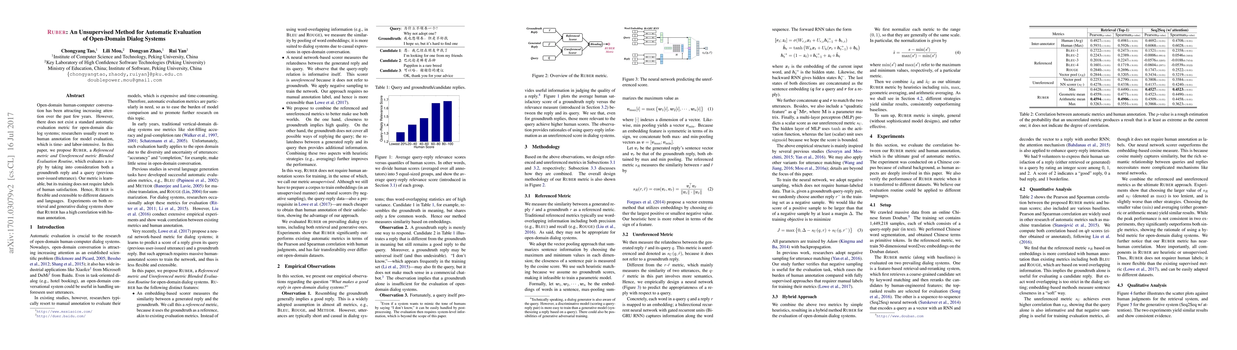Open-domain human-computer conversation has been attracting increasing attention over the past few years. However, there does not exist a standard automatic evaluation metric for open-domain dialog systems; researchers usually resort to human annotation for model evaluation, which is time- and labor-intensive. In this paper, we propose RUBER, a Referenced metric and Unreferenced metric Blended Evaluation Routine, which evaluates a reply by taking into consideration both a groundtruth reply and a query (previous user-issued utterance). Our metric is learnable, but its training does not require labels of human satisfaction. Hence, RUBER is flexible and extensible to different datasets and languages. Experiments on both retrieval and generative dialog systems show that RUBER has a high correlation with human annotation.