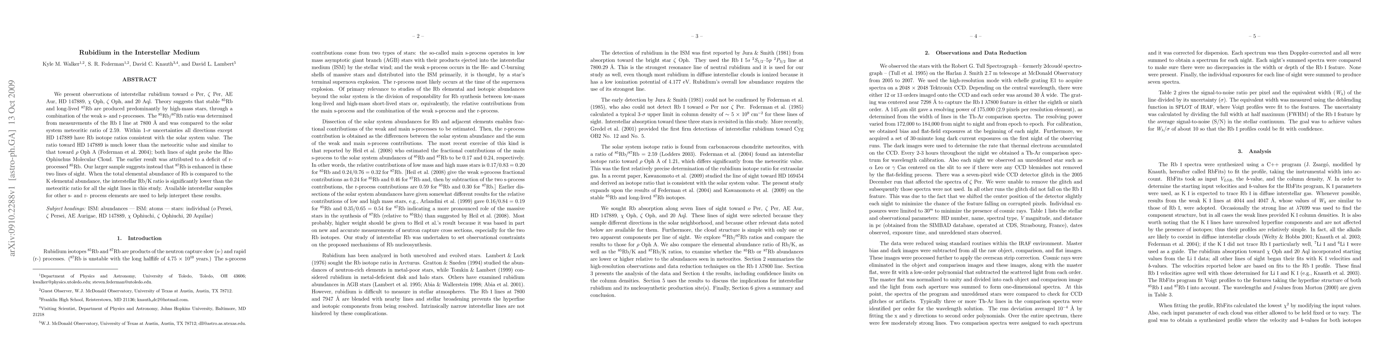 We present observations of interstellar rubidium toward o Per, zeta Per, AE Aur, HD 147889, chi Oph, zeta Oph, and 20 Aql. Theory suggests that stable 85Rb and long-lived 87Rb are produced predominantly by high-mass stars, through a combination of the weak s- and r-processes. The 85Rb/87Rb ratio was determined from measurements of the Rb I line at 7800 angstroms and was compared to the solar system meteoritic ratio of 2.59. Within 1-sigma uncertainties all directions except HD 147889 have Rb isotope ratios consistent with the solar system value. The ratio toward HD 147889 is much lower than the meteoritic value and similar to that toward rho Oph A (Federman et al. 2004); both lines of sight probe the Rho Ophiuchus Molecular Cloud. The earlier result was attributed to a deficit of r-processed 85Rb. Our larger sample suggests instead that 87Rb is enhanced in these two lines of sight. When the total elemental abundance of Rb is compared to the K elemental abundance, the interstellar Rb/K ratio is significantly lower than the meteoritic ratio for all the sight lines in this study. Available interstellar samples for other s- and r- process elements are used to help interpret these results.
