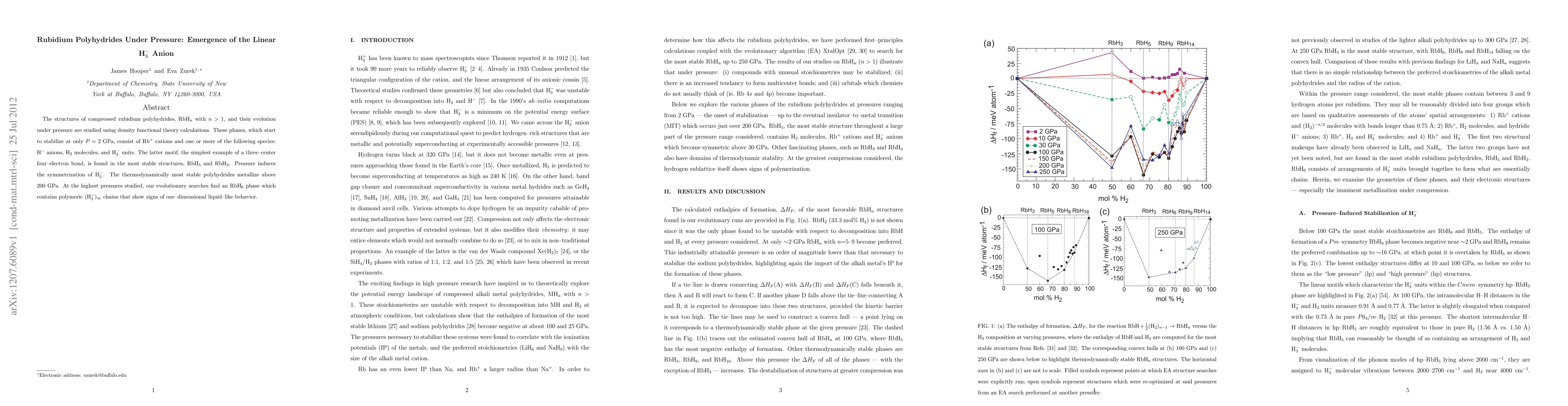 The structures of compressed rubidium polyhydrides, RbHn with n>1, and their evolution under pressure are studied using density functional theory calculations. These phases, which start to stabilize at only P=2 GPa, consist of Rb+ cations and one or more of the following species: H- anions, H2 molecules, and H3- units. The latter motif, the simplest example of a three-center four-electron bond, is found in the most stable structures, RbH5 and RbH3. Pressure induces the symmetrization of H3-. The thermodynamically most stable polyhydrides metallize above 200 GPa. At the highest pressures studied, our evolutionary searches find an RbH6 phase which contains polymeric (H3-)$_\infty$ chains that show signs of one-dimensional liquid-like behavior.