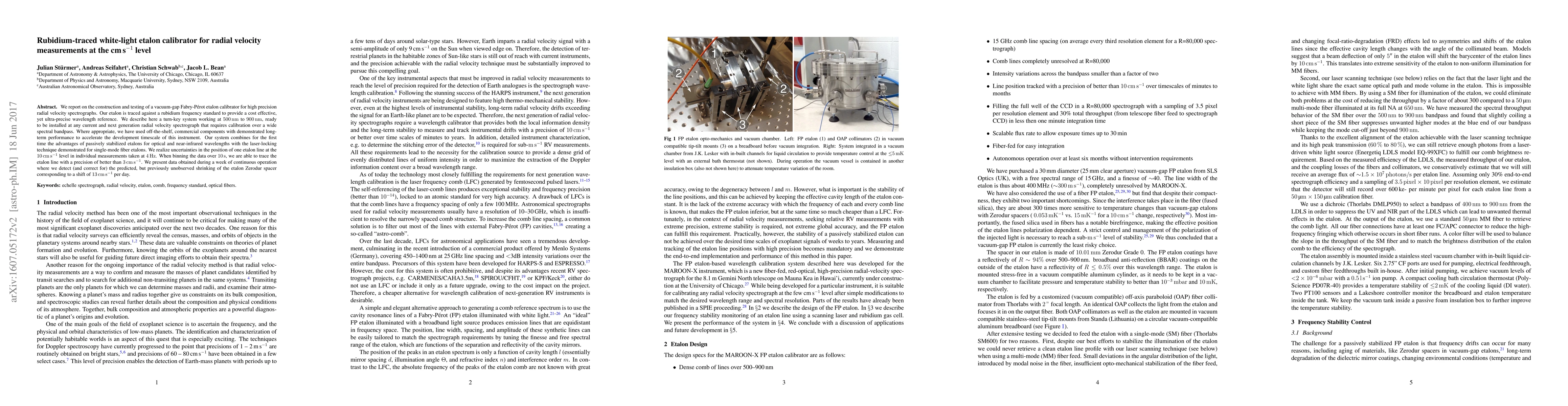 This paper details the development of a vacuum-gap Fabry-Pérot etalon calibrator, traced against a rubidium frequency standard, for high-precision radial velocity measurements. The system achieves uncertainties of 10 cm/s per measurement and better than 3 cm/s over 10 seconds, and corrects for the previously unobserved shrinking of the etalon spacer.