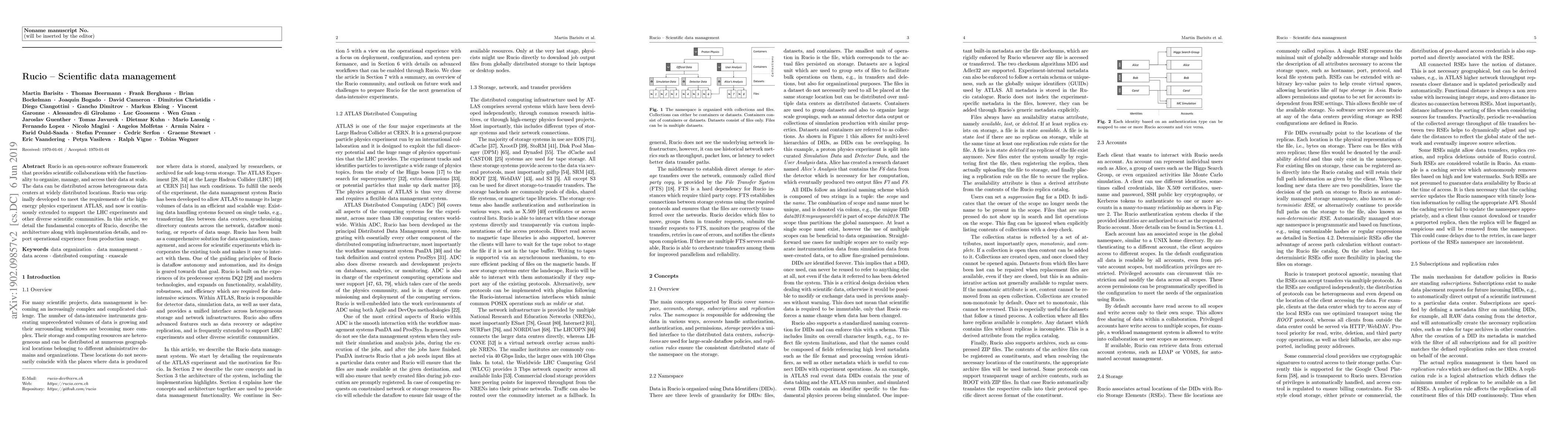 Rucio is an open-source software framework that provides scientific collaborations with the functionality to organize, manage, and access their data at scale. The data can be distributed across heterogeneous data centers at widely distributed locations. Rucio was originally developed to meet the requirements of the high-energy physics experiment ATLAS, and now is continuously extended to support the LHC experiments and other diverse scientific communities. In this article, we detail the fundamental concepts of Rucio, describe the architecture along with implementation details, and give operational experience from production usage.