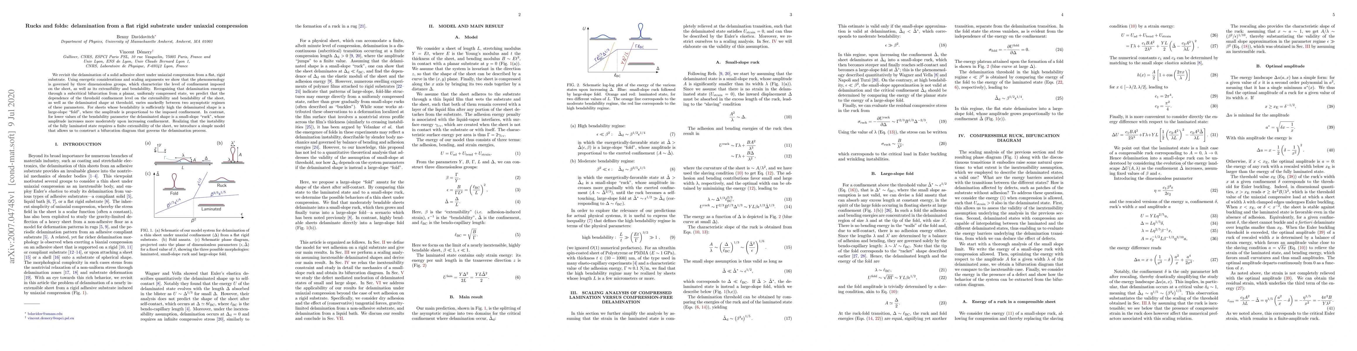 We revisit the delamination of a solid adhesive sheet under uniaxial compression from a flat, rigid substrate. Using energetic considerations and scaling arguments we show that the phenomenology is governed by three dimensionless groups, which characterize the level of confinement imposed on the sheet, as well as its extensibility and bendability. Recognizing that delamination emerges through a subcritical bifurcation from a planar, uniformly compressed state, we predict that the dependence of the threshold confinement level on the extensibility and bendability of the sheet, as well as the delaminated shape at threshold, varies markedly between two asymptotic regimes of these parameters. For sheets whose bendability is sufficiently high the delaminated shape is a large-slope "fold", where the amplitude is proportional to the imposed confinement. In contrast, for lower values of the bendability parameter the delaminated shape is a small-slope "ruck", whose amplitude increases more moderately upon increasing confinement. Realizing that the instability of the fully laminated state requires a finite extensibility of the sheet, we introduce a simple model that allows us to construct a bifurcation diagram that governs the delamination process.