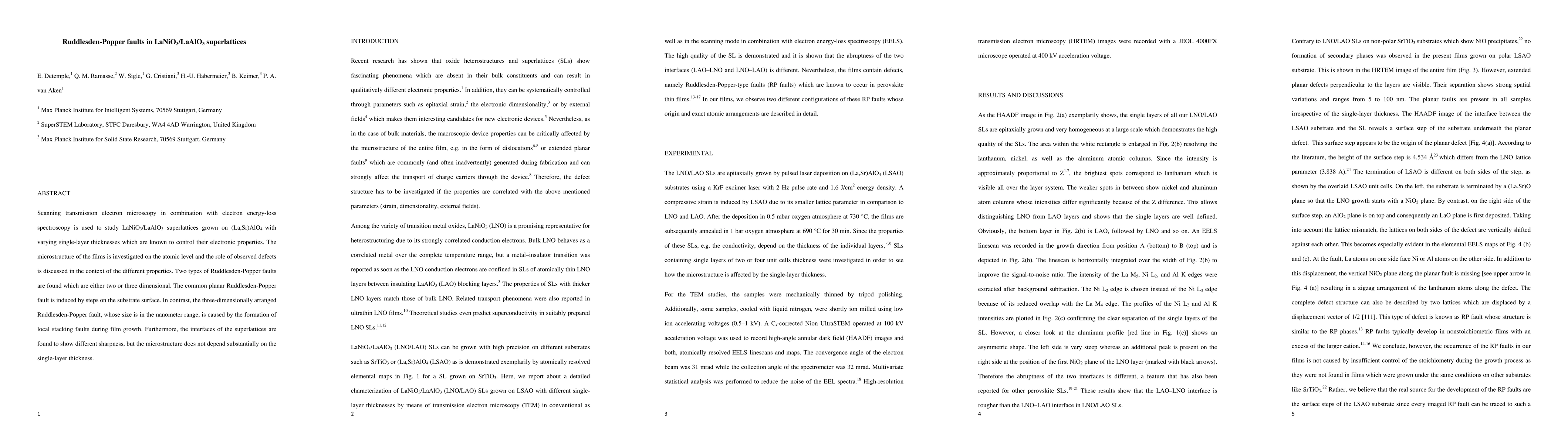 This study uses scanning transmission electron microscopy and electron energy-loss spectroscopy to investigate LaNiO3/LaAlO3 superlattices, identifying two types of Ruddlesden-Popper faults—planar and three-dimensional—that affect the films' microstructure and electronic properties. The planar faults are substrate-induced, while the three-dimensional faults arise from local stacking faults during growth.