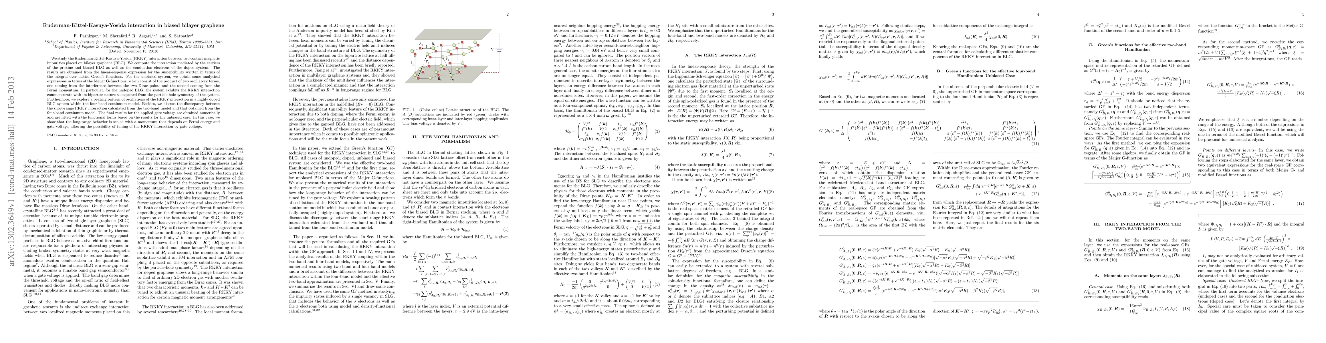 We study the Ruderman-Kittel-Kasuya-Yosida (RKKY) interaction between two contact magnetic impurities placed on bilayer graphene (BLG). We compute the interaction mediated by the carriers of the pristine and biased BLG as well as the conduction electrons of the doped system. The results are obtained from the linear-response expression for the susceptibility written in terms of the integral over lattice Green's functions. For the unbiased system, we obtain some analytical expressions in terms of the Meijer G-functions, which consist of the product of two oscillatory terms, one coming from the interference between the two Dirac points and the second coming from the Fermi momentum. In particular, for the undoped BLG, the system exhibits the RKKY interaction commensurate with its bipartite nature as expected from the particle-hole symmetry of the system. Furthermore, we explore a beating pattern of oscillations of the RKKY interaction in a highly doped BLG system within the four-band continuum model. Besides, we discuss the discrepancy between the short-range RKKY interaction calculated from the two-band model and that obtained from the four-band continuum model. The final results for the applied gate voltage are obtained numerically and are fitted with the functional forms based on the results for the unbiased case. In this case, we show that the long-range behavior is scaled with a momentum that depends on Fermi energy and gate voltage, allowing the possibility of tuning of the RKKY interaction by gate voltage.