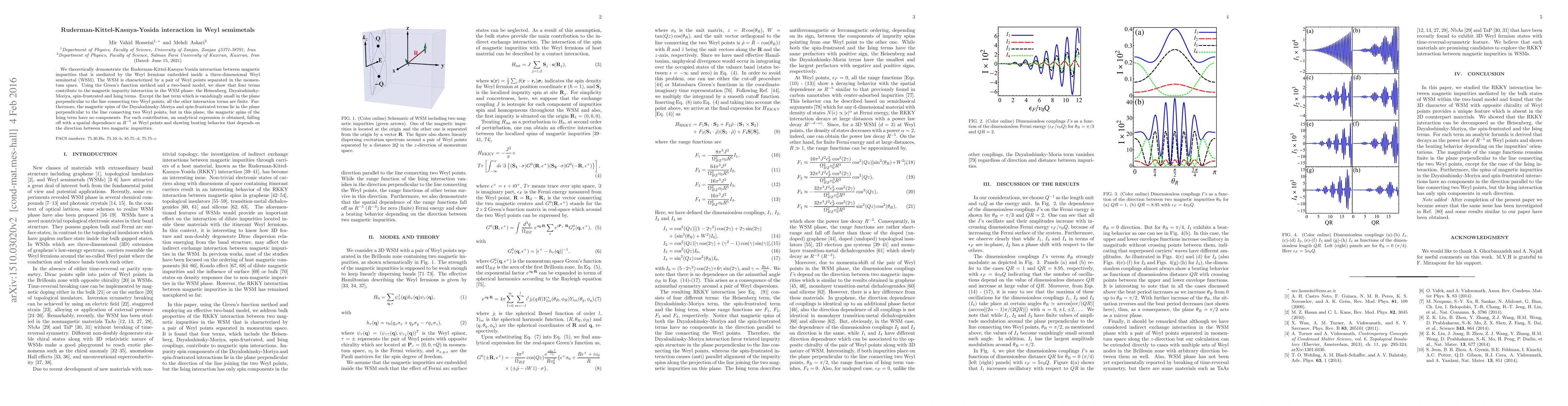 This paper theoretically investigates the Ruderman-Kittel-Kasuya-Yosida interaction in Weyl semimetals, revealing that Weyl fermions mediate four interaction terms: Heisenberg, Dzyaloshinsky-Moriya, spin-frustrated, and Ising, with the Ising term being negligible in the plane perpendicular to the Weyl points. The interaction decays as $R^{-5}$ and exhibits direction-dependent beating behavior.