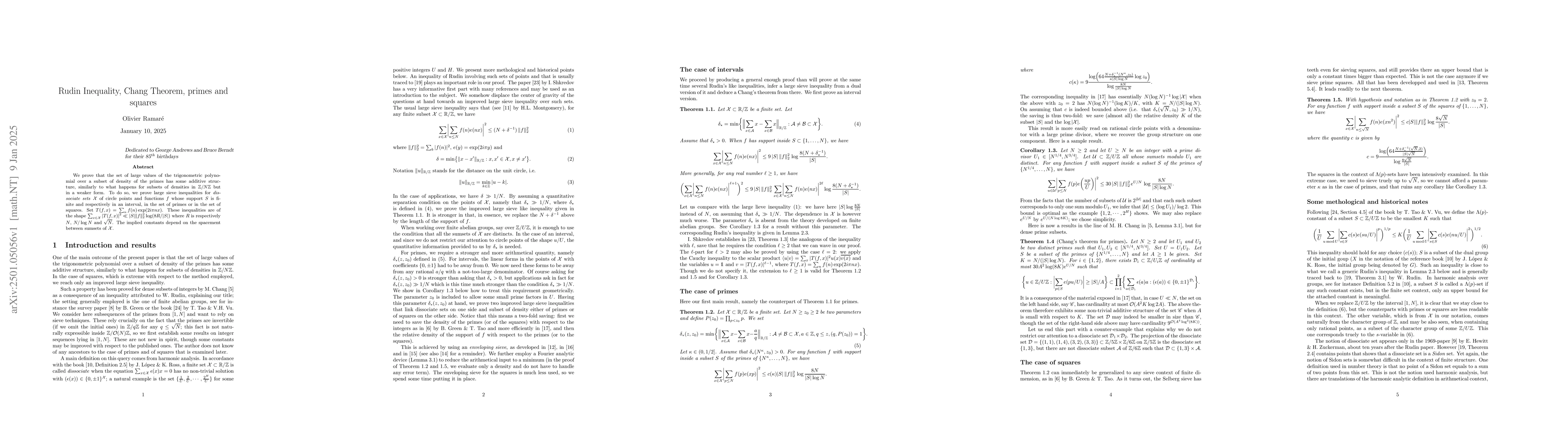 This paper proves large sieve inequalities for trigonometric polynomials over subsets of primes and squares, establishing additive structures similar to those found in $\mathbb{Z}/{N}\mathbb{Z}$. The inequalities involve dissociate sets $\mathcal{X}$ and have constants dependent on the spacing between sumsets of $\mathcal{X}$.