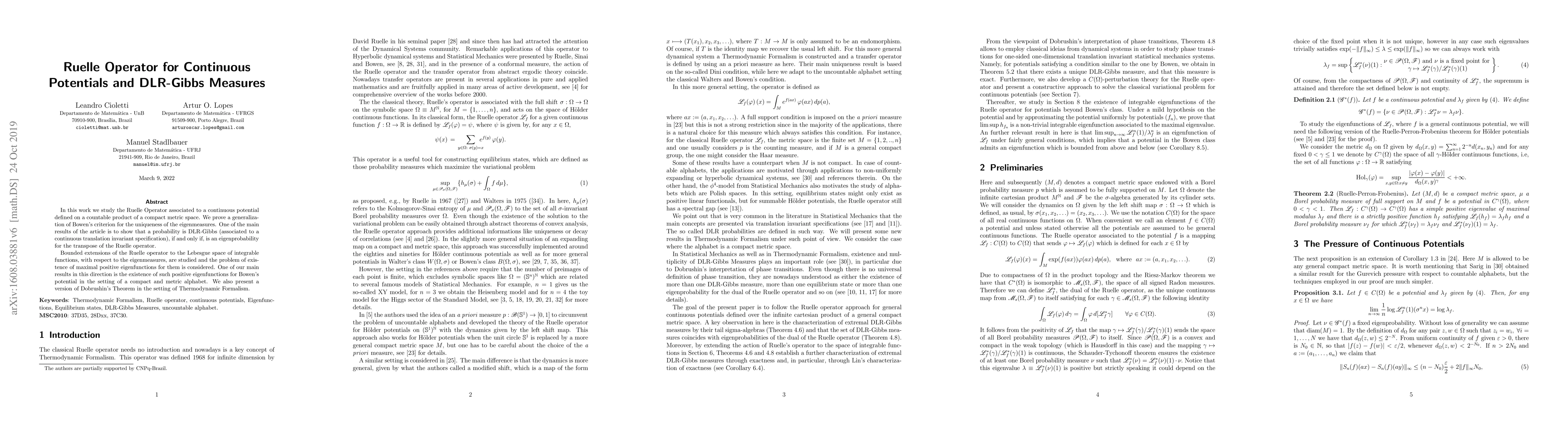 This paper explores the Ruelle operator for continuous potentials and establishes a connection between DLR-Gibbs measures and eigenmeasures. It proves the uniqueness of eigenmeasures via a generalized Bowen's criterion and demonstrates the existence of maximal positive eigenfunctions for Bowen's potential in a compact metric setting.