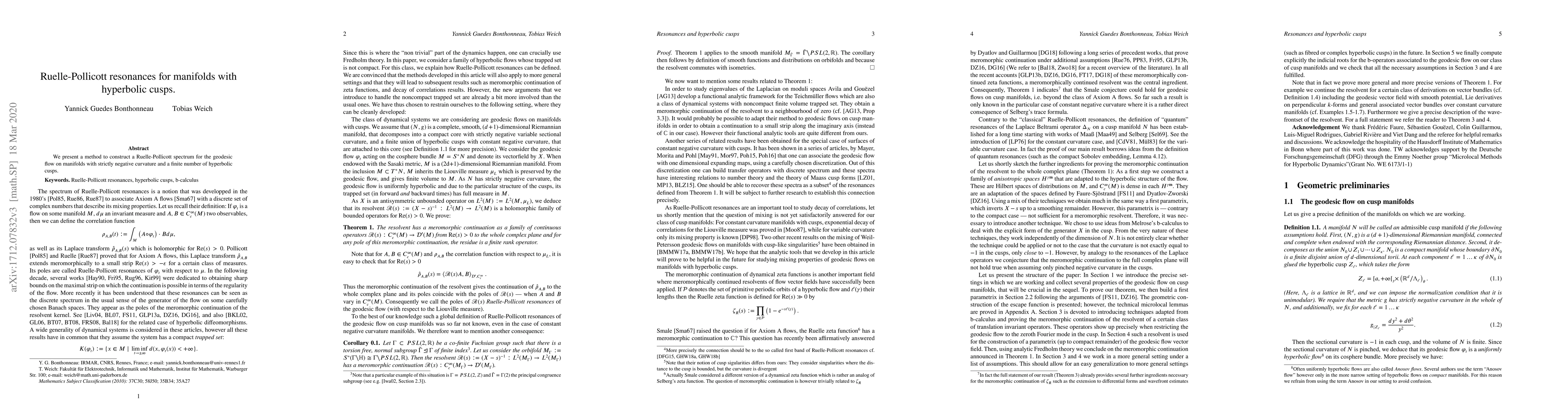 We present new methods to construct a Ruelle-Pollicott spectrum for the geodesic flow on manifolds with strictly negative curvature and a finite number of hyperbolic cusps.
