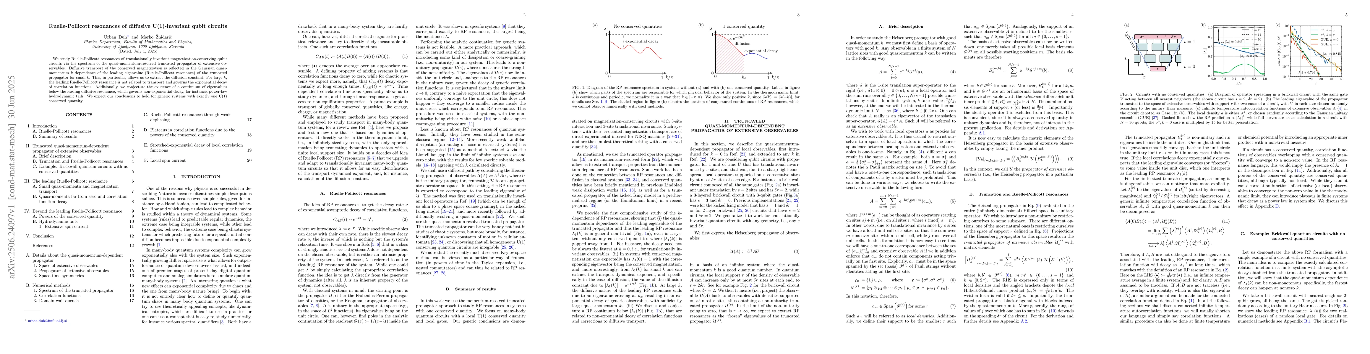 We study Ruelle-Pollicott resonances of translationally invariant magnetization-conserving qubit circuits via the spectrum of the quasi-momentum-resolved truncated propagator of extensive observables. Diffusive transport of the conserved magnetization is reflected in the Gaussian quasi-momentum $k$ dependence of the leading eigenvalue (Ruelle-Pollicott resonance) of the truncated propagator for small $k$. This, in particular, allows us to extract the diffusion constant. For large $k$, the leading Ruelle-Pollicott resonance is not related to transport and governs the exponential decay of correlation functions. Additionally, we conjecture the existence of a continuum of eigenvalues below the leading diffusive resonance, which governs non-exponential decay, for instance, power-law hydrodynamic tails. We expect our conclusions to hold for generic systems with exactly one U(1) conserved quantity.