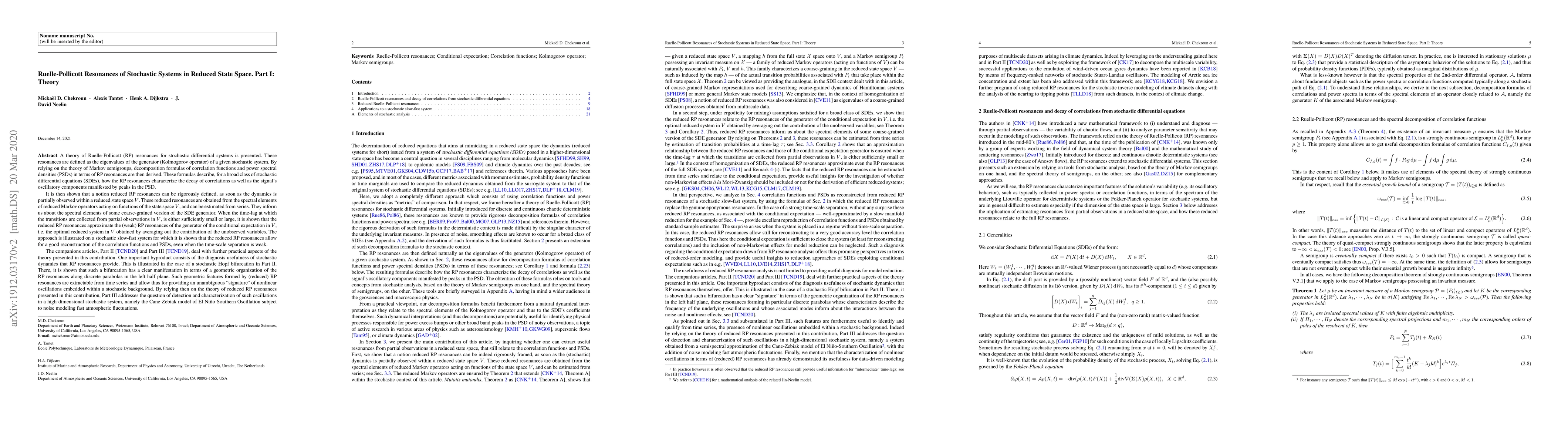 A theory of Ruelle-Pollicott (RP) resonances for stochastic differential systems is presented. These resonances are defined as the eigenvalues of the generator (Kolmogorov operator) of a given stochastic system. By relying on the theory of Markov semigroups, decomposition formulas of correlation functions and power spectral densities (PSDs) in terms of RP resonances are then derived. These formulas describe, for a broad class of stochastic differential equations (SDEs), how the RP resonances characterize the decay of correlations as well as the signal's oscillatory components manifested by peaks in the PSD.It is then shown that a notion reduced RP resonances can be rigorously defined, as soon as the dynamics is partially observed within a reduced state space V . These reduced resonances are obtained from the spectral elements of reduced Markov operators acting on functions of the state space V , and can be estimated from series. They inform us about the spectral elements of some coarse-grained version of the SDE generator. When the time-lag at which the transitions are collected from partial observations in V , is either sufficiently small or large, it is shown that the reduced RP resonances approximate the (weak) RP resonances of the generator of the conditional expectation in V , i.e. the optimal reduced system in V obtained by averaging out the contribution of the unobserved variables. The approach is illustrated on a stochastic slow-fast system for which it is shown that the reduced RP resonances allow for a good reconstruction of the correlation functions and PSDs, even when the time-scale separation is weak.The companions articles, Part II and Part III, deal with further practical aspects of the theory presented in this contribution. One important byproduct consists of the diagnosis usefulness of stochastic dynamics that RP resonances provide. This is illustrated in the case of a stochastic Hopf bifurcation in Part II. There, it is shown that such a bifurcation has a clear manifestation in terms of a geometric organization of the RP resonances along discrete parabolas in the left half plane. Such geometric features formed by (reduced) RP resonances are extractable from time series and allow thus for providing an unambiguous "signature" of nonlinear oscillations embedded within a stochastic background. By relying then on the theory of reduced RP resonances presented in this contribution, Part III addresses the question of detection and characterization of such oscillations in a high-dimensional stochastic system, namely the Cane-Zebiak model of El Ni{\~n}o-Southern Oscillation subject to noise modeling fast atmospheric fluctuations.
