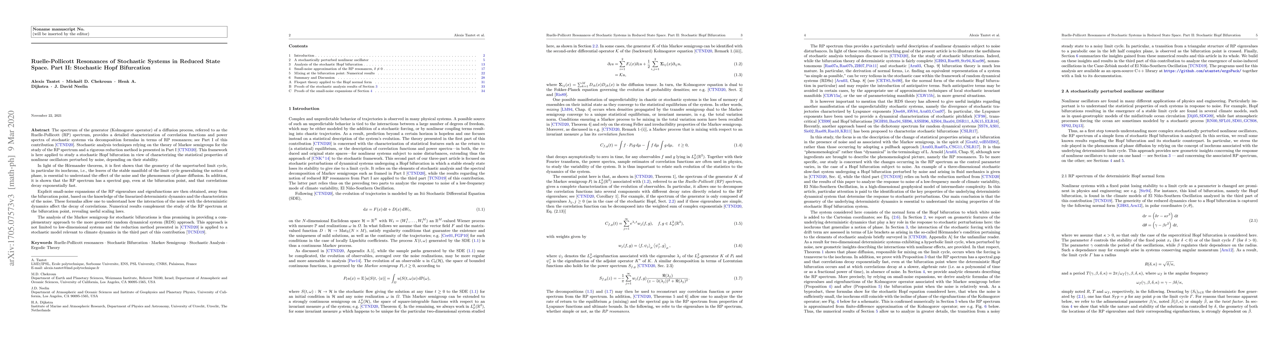 The spectrum of the generator (Kolmogorov operator) of a diffusion process, referred to as the Ruelle-Pollicott (RP) spectrum, provides a detailed characterization of correlation functions and power spectra of stochastic systems via decomposition formulas in terms of RP resonances. Stochastic analysis techniques relying on the theory of Markov semigroups for the study of the RP spectrum and a rigorous reduction method is presented in Part I. This framework is here applied to study a stochastic Hopf bifurcation in view of characterizing the statistical properties of nonlinear oscillators perturbed by noise, depending on their stability. In light of the H\"ormander theorem, it is first shown that the geometry of the unperturbed limit cycle, in particular its isochrons, is essential to understand the effect of noise and the phenomenon of phase diffusion. In addition, it is shown that the spectrum has a spectral gap, even at the bifurcation point, and that correlations decay exponentially fast. Explicit small-noise expansions of the RP eigenvalues and eigenfunctions are then obtained, away from the bifurcation point, based on the knowledge of the linearized deterministic dynamics and the characteristics of the noise. These formulas allow one to understand how the interaction of the noise with the deterministic dynamics affect the decay of correlations. Numerical results complement the study of the RP spectrum at the bifurcation, revealing useful scaling laws. The analysis of the Markov semigroup for stochastic bifurcations is thus promising in providing a complementary approach to the more geometric random dynamical system approach. This approach is not limited to low-dimensional systems and the reduction method presented in part I is applied to a stochastic model relevant to climate dynamics in part III.