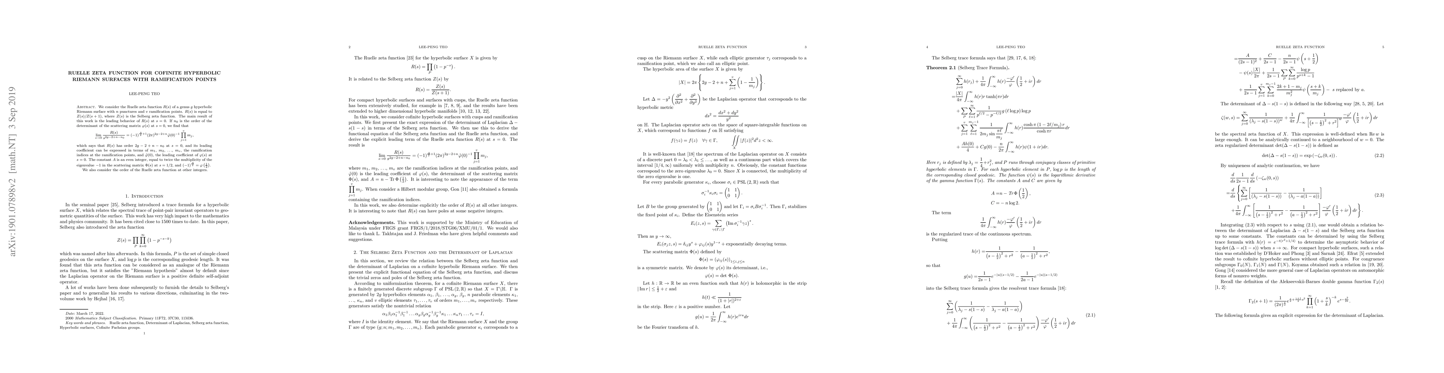 We consider the Ruelle zeta function $R(s)$ of a genus $g$ hyperbolic Riemann surface with $n$ punctures and $v$ ramification points. $R(s)$ is equal to $Z(s)/Z(s+1)$, where $Z(s)$ is the Selberg zeta function. The main result of this work is the leading behavior of $R(s)$ at $s=0$. If $n_0$ is the order of the determinant of the scattering matrix $\varphi(s)$ at $s=0$, we find that \begin{align*} \lim_{s\rightarrow 0}\frac{R(s)}{s^{2g-2+n-n_0}}=(-1)^{\frac{A}{2}+1}(2\pi)^{2g-2+n }\tilde{\varphi}(0)^{-1} \prod_{j=1}^v m_j, \end{align*}which says that $R(s)$ has order $2g-2+n-n_0$ at $s=0$, and its leading coefficient can be expressed in terms of $m_1$, $m_2$, $\ldots$, $m_v$, the ramification indices at the ramification points, and $\tilde{\varphi}(0)$, the leading coefficient of $\varphi(s)$ at $s=0$. The constant $A$ is an even integer, equal to twice the multiplicity of the eigenvalue $-1$ in the scattering matrix $\Phi(s)$ at $s=1/2$, and $(-1)^{\frac{A}{2}}=\varphi\left(\frac{1}{2}\right)$. We also consider the order of the Ruelle zeta function at other integers.