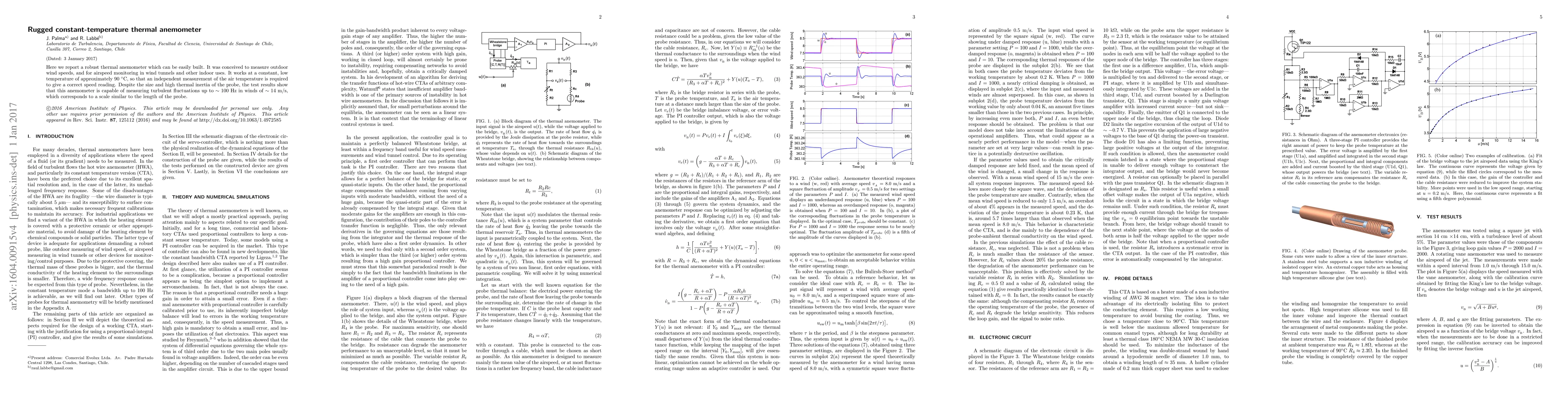 This paper presents a rugged, easily constructed thermal anemometer designed for measuring outdoor wind speeds and indoor airspeeds, operating at a constant temperature of 90°C. Despite its size and thermal inertia, the device can accurately measure turbulent wind fluctuations up to 100 Hz in winds up to 14 m/s.