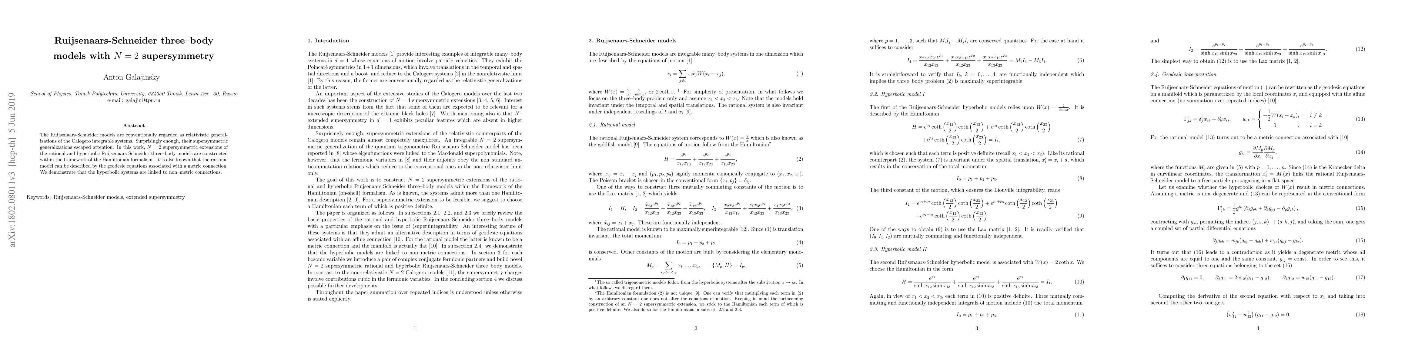 The Ruijsenaars-Schneider models are conventionally regarded as relativistic generalizations of the Calogero integrable systems. Surprisingly enough, their supersymmetric generalizations escaped attention. In this work, N=2 supersymmetric extensions of the rational and hyperbolic Ruijsenaars-Schneider three-body models are constructed within the framework of the Hamiltonian formalism. It is also known that the rational model can be described by the geodesic equations associated with a metric connection. We demonstrate that the hyperbolic systems are linked to non-metric connections.