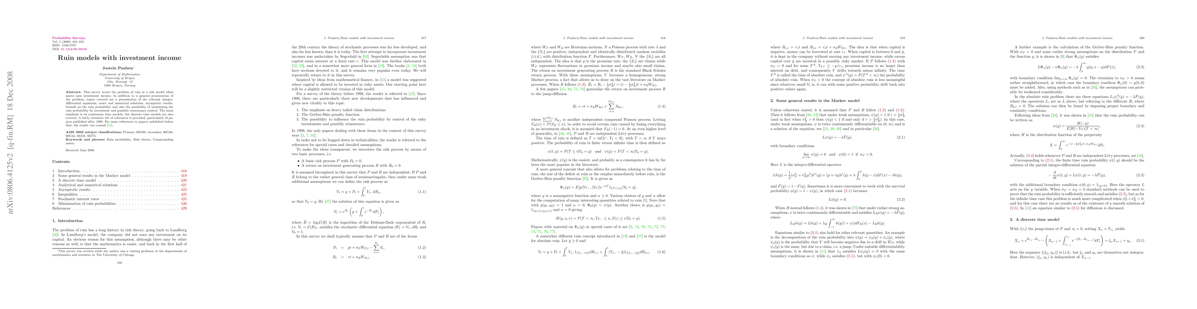 This survey treats the problem of ruin in a risk model when assets earn investment income. In addition to a general presentation of the problem, topics covered are a presentation of the relevant integro-differential equations, exact and numerical solutions, asymptotic results, bounds on the ruin probability and also the possibility of minimizing the ruin probability by investment and possibly reinsurance control. The main emphasis is on continuous time models, but discrete time models are also covered. A fairly extensive list of references is provided, particularly of papers published after 1998. For more references to papers published before that, the reader can consult [47].