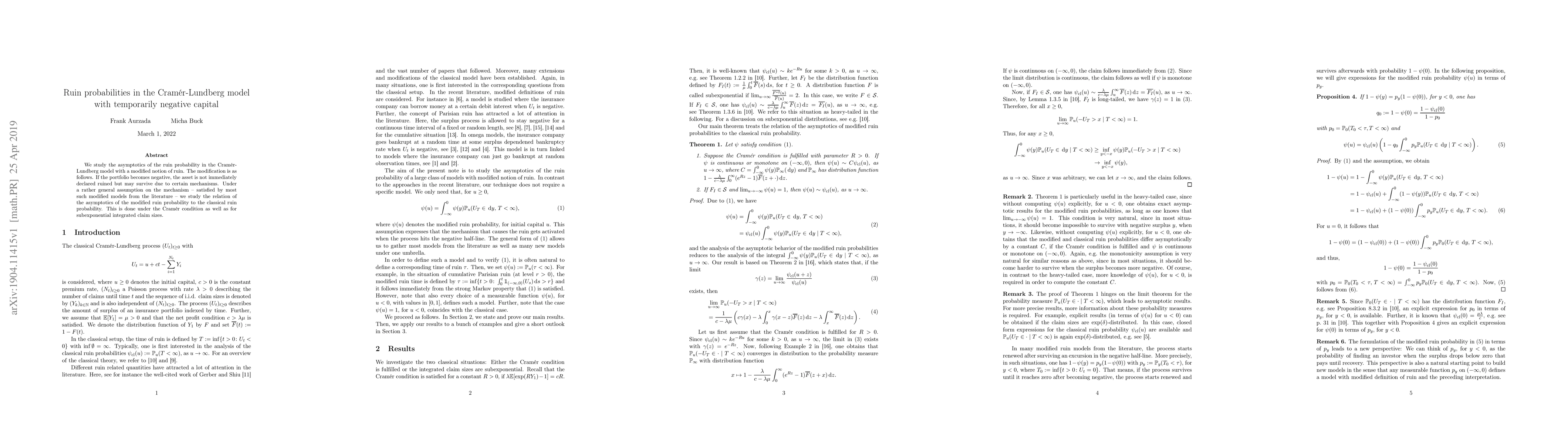 We study the asymptotics of the ruin probability in the Cram\'er-Lundberg model with a modified notion of ruin. The modification is as follows. If the portfolio becomes negative, the asset is not immediately declared ruined but may survive due to certain mechanisms. Under a rather general assumption on the mechanism - satisfied by most such modified models from the literature - we study the relation of the asymptotics of the modified ruin probability to the classical ruin probability. This is done under the Cram\'er condition as well as for subexponential integrated claim sizes.