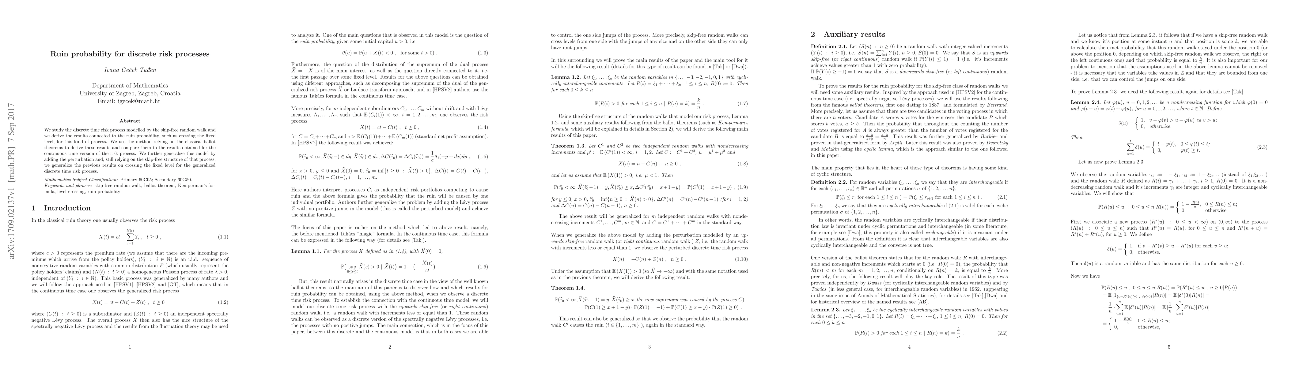 We study the discrete time risk process modelled by the skip-free random walk and we derive the results connected to the ruin probability, such as crossing the fixed level, for this kind of process. We use the method relying on the classical ballot theorems to derive these results and compare them to the results obtained for the continuous time version of the risk process. We further generalize this model by adding the perturbation and, still relying on the skip-free structure of that process, we generalize the previous results on crossing the fixed level for the generalized discrete time risk process.