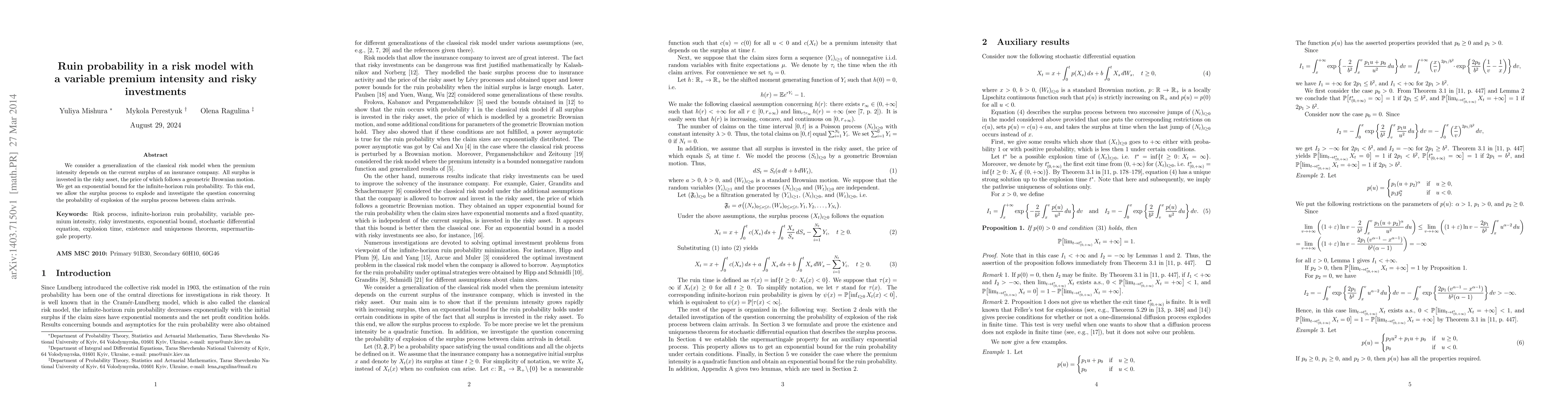 This paper generalizes the classical risk model by incorporating a premium intensity that varies with the current surplus, with all surplus invested in a risky asset modeled by a geometric Brownian motion. It derives an exponential bound for the infinite-horizon ruin probability and explores the probability of the surplus process exploding between claim arrivals.