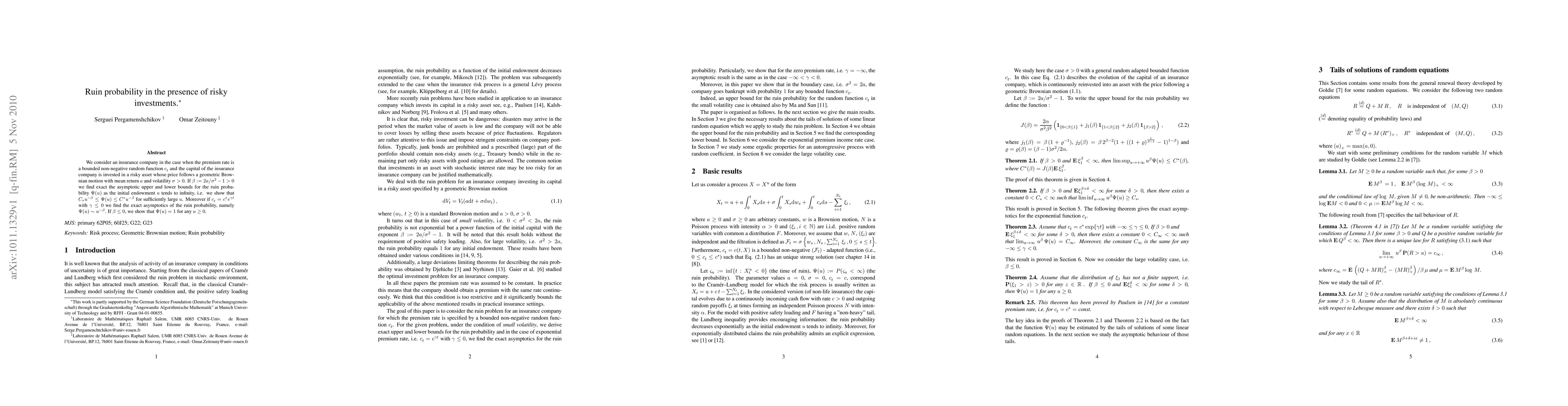 This paper investigates the ruin probability for an insurance company with a premium rate modeled as a bounded random function and capital invested in a risky asset. It provides exact asymptotic bounds for the ruin probability as initial capital grows large, showing $\Psi(u)\sim u^{-\beta}$ under specific conditions.