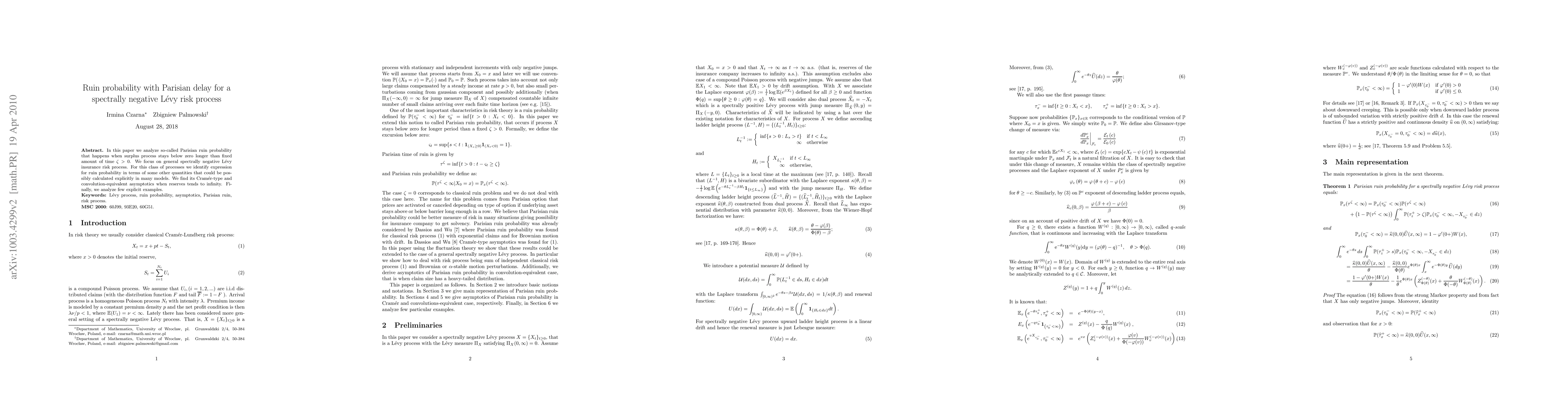 This paper investigates the Parisian ruin probability for a spectrally negative Lévy risk process, where ruin occurs if the surplus drops below zero for a fixed duration. It derives an explicit expression for this probability and examines its asymptotic behavior as reserves grow large, concluding with specific model examples.