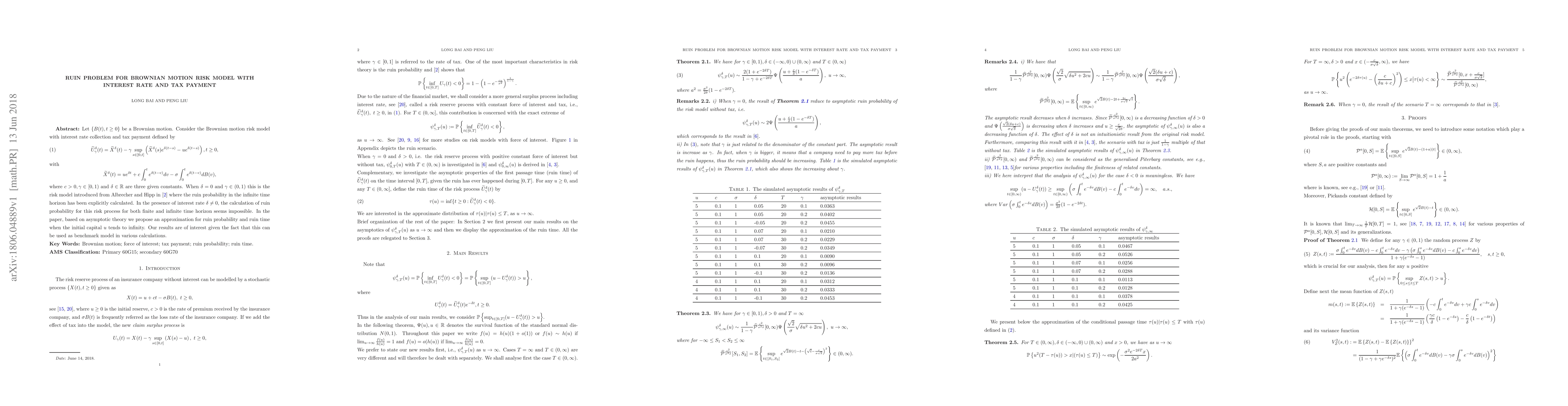 A study on a Brownian motion risk model with interest rate and tax payment introduces an approximation for ruin probability and ruin time as the initial capital approaches infinity, providing a benchmark for calculations.