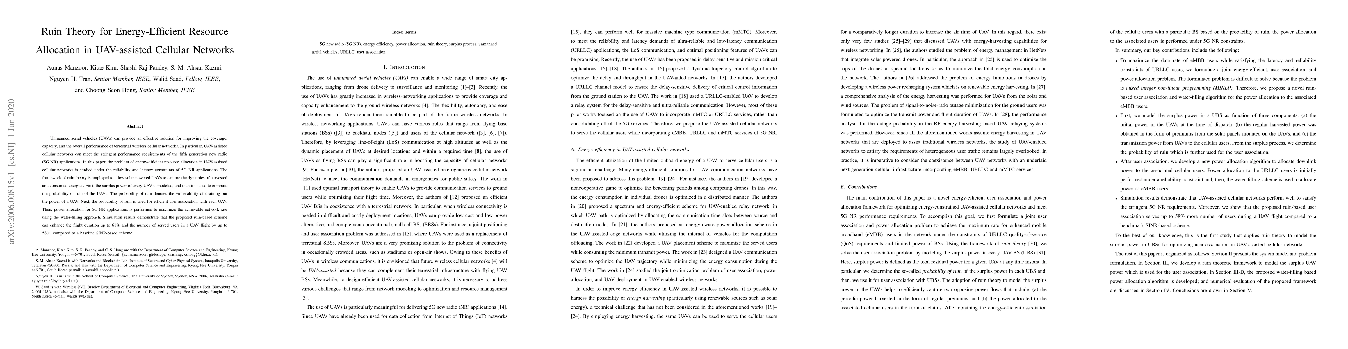 This paper explores energy-efficient resource allocation in UAV-assisted cellular networks using ruin theory to model solar-powered UAVs' energy dynamics. The proposed method enhances the flight duration and number of served users by up to 61% and 58%, respectively, compared to a baseline SINR-based scheme.