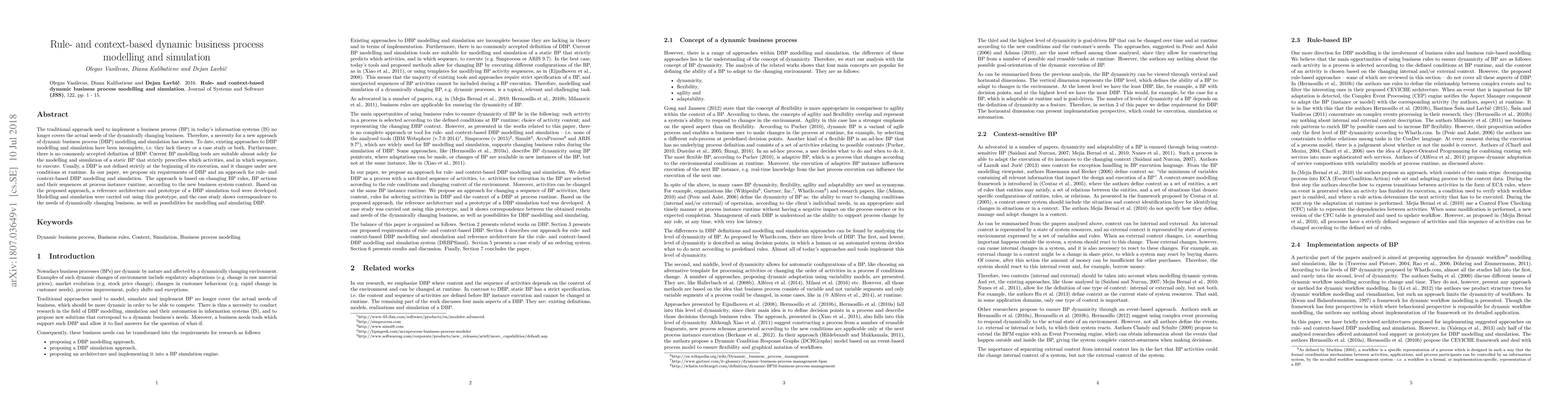 The traditional approach used to implement a business process (BP) in today's information systems (IS) no longer covers the actual needs of the dynamically changing business. Therefore, a necessity for a new approach of dynamic business process (DBP) modelling and simulation has arisen. To date, existing approaches to DBP modelling and simulation have been incomplete, i.e. they lack theory or a case study or both. Furthermore, there is no commonly accepted definition of BDP. Current BP modelling tools are suitable almost solely for the modelling and simulation of a static BP that strictly prescribes which activities, and in which sequence, to execute. Usually, a DBP is not defined strictly at the beginning of its execution, and it changes under new conditions at runtime. In our paper, we propose six requirements of DBP and an approach for rule- and context-based DBP modelling and simulation. The approach is based on changing BP rules, BP actions and their sequences at process instance runtime, according to the new business system context. Based on the proposed approach, a reference architecture and prototype of a DBP simulation tool were developed. Modelling and simulation were carried out using this prototype, and the case study shows correspondence to the needs of dynamically changing business, as well as possibilities for modelling and simulating DBP.