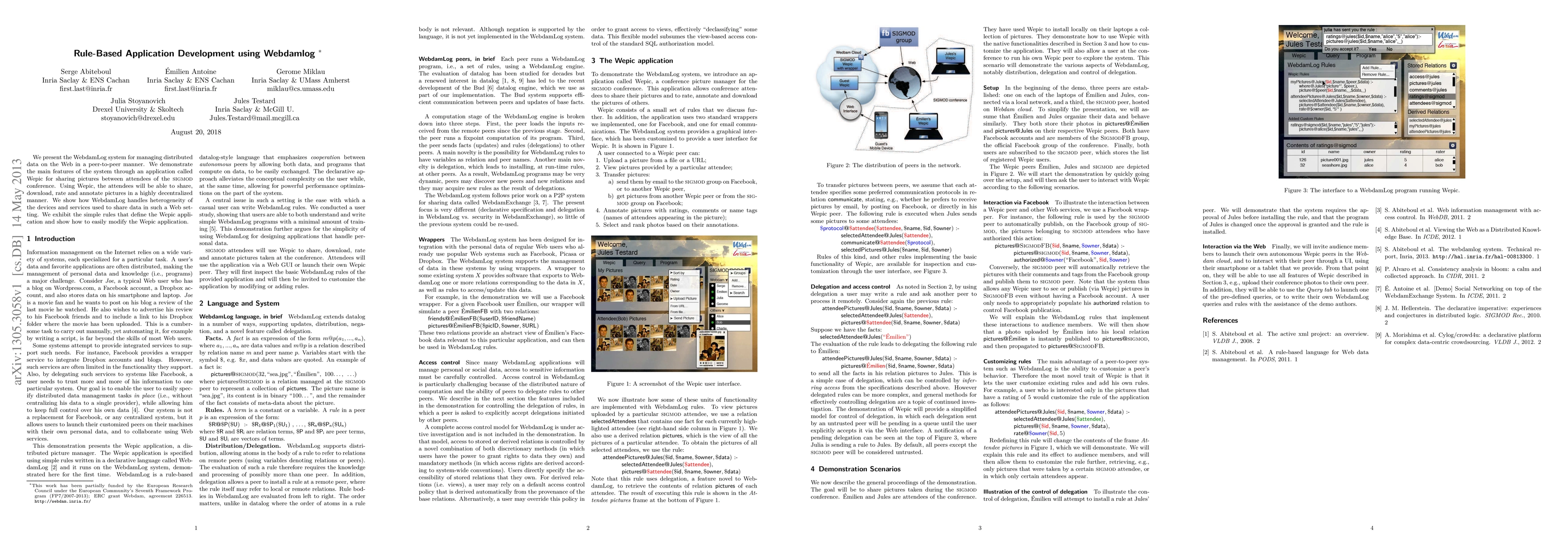 The WebdamLog system enables decentralized data management in a peer-to-peer web setting, demonstrated through the Wepic application for sharing conference pictures. It showcases simple rules for application development and modification.