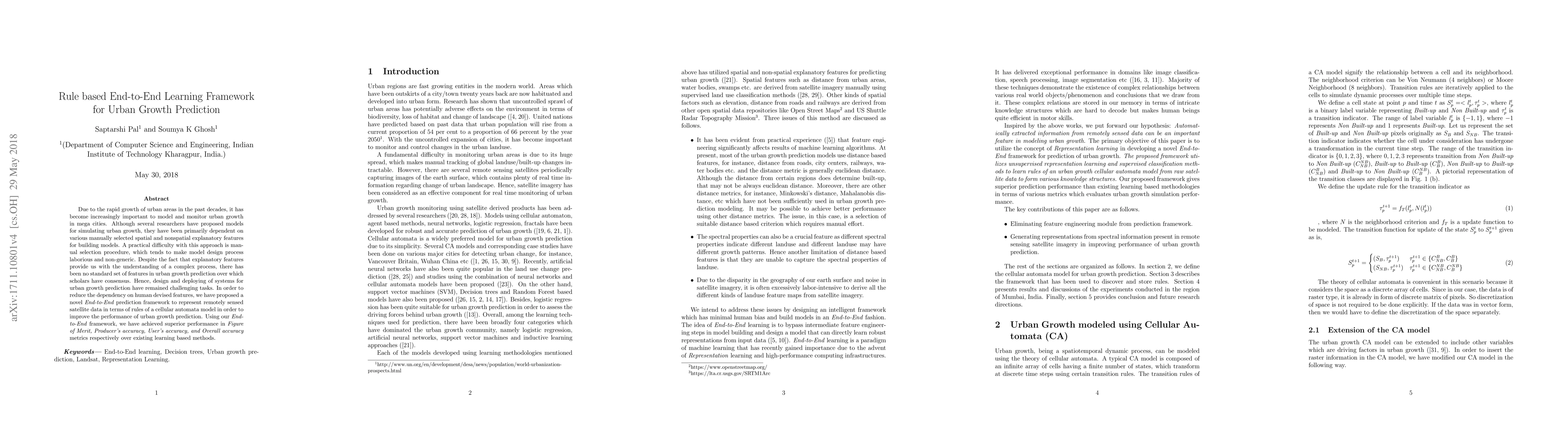 This paper proposes an End-to-End learning framework for predicting urban growth in mega cities, aiming to reduce reliance on manually selected features. The framework uses rules derived from remotely sensed satellite data to improve prediction performance, achieving better accuracy metrics compared to existing methods.