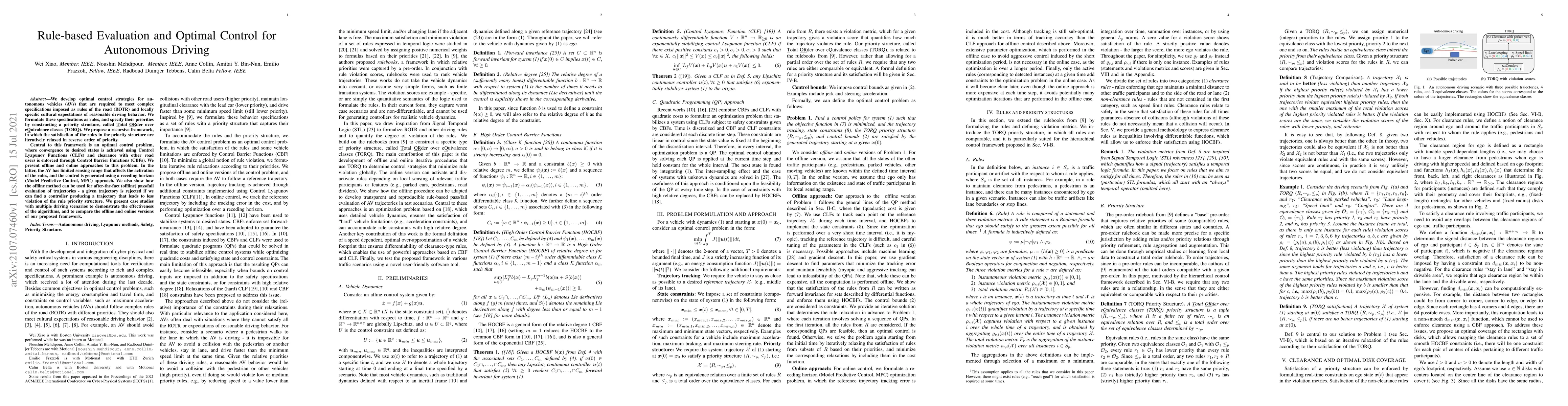 We develop optimal control strategies for autonomous vehicles (AVs) that are required to meet complex specifications imposed as rules of the road (ROTR) and locally specific cultural expectations of reasonable driving behavior. We formulate these specifications as rules, and specify their priorities by constructing a priority structure, called \underline{T}otal \underline{OR}der over e\underline{Q}uivalence classes (TORQ). We propose a recursive framework, in which the satisfaction of the rules in the priority structure are iteratively relaxed in reverse order of priority. Central to this framework is an optimal control problem, where convergence to desired states is achieved using Control Lyapunov Functions (CLFs) and clearance with other road users is enforced through Control Barrier Functions (CBFs). We present offline and online approaches to this problem. In the latter, the AV has limited sensing range that affects the activation of the rules, and the control is generated using a receding horizon (Model Predictive Control, MPC) approach. We also show how the offline method can be used for after-the-fact (offline) pass/fail evaluation of trajectories - a given trajectory is rejected if we can find a controller producing a trajectory that leads to less violation of the rule priority structure. We present case studies with multiple driving scenarios to demonstrate the effectiveness of the algorithms, and to compare the offline and online versions of our proposed framework.
