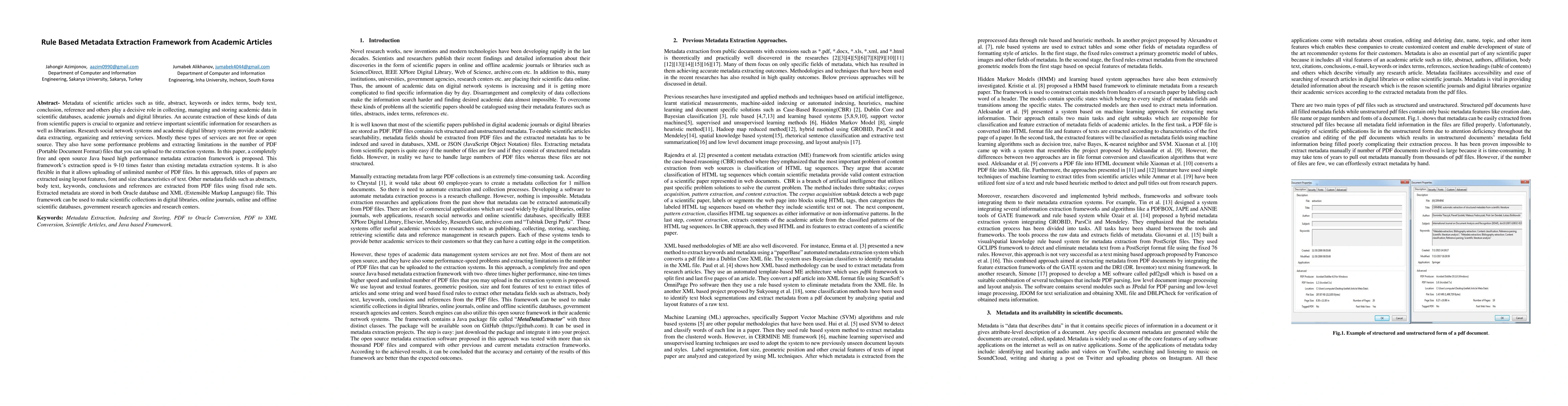 This paper proposes a free, open-source Java-based metadata extraction framework for academic articles, significantly faster than existing systems and capable of processing unlimited PDF files. It extracts metadata using layout features and fixed rule sets, storing results in Oracle databases and XML files.