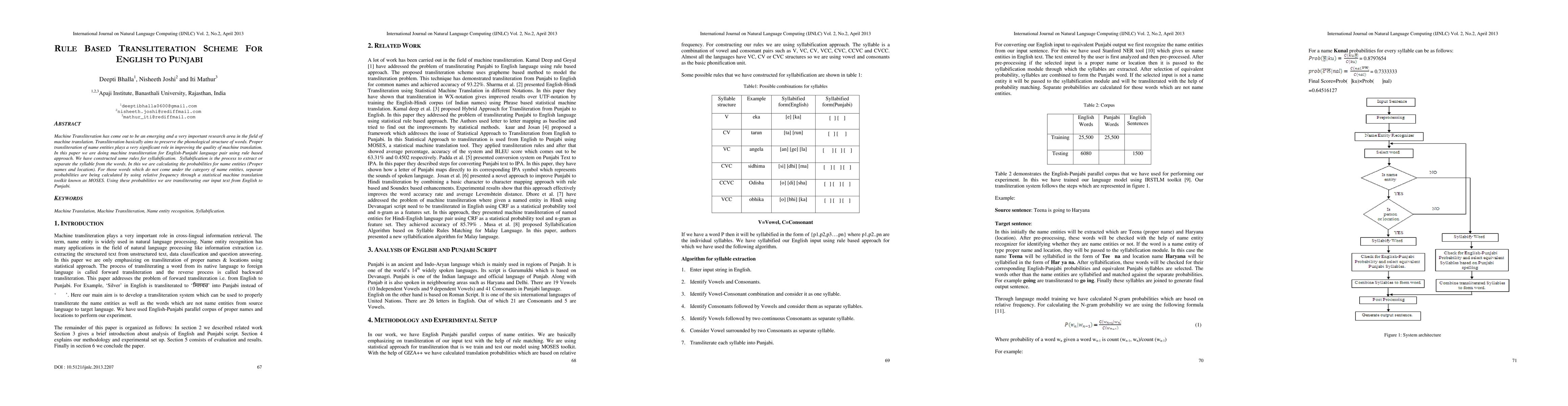 This paper presents a rule-based transliteration scheme for converting English to Punjabi, focusing on preserving phonological structures. It employs syllabification rules and calculates probabilities for proper names and location entities, using a statistical machine translation toolkit for non-name entities.