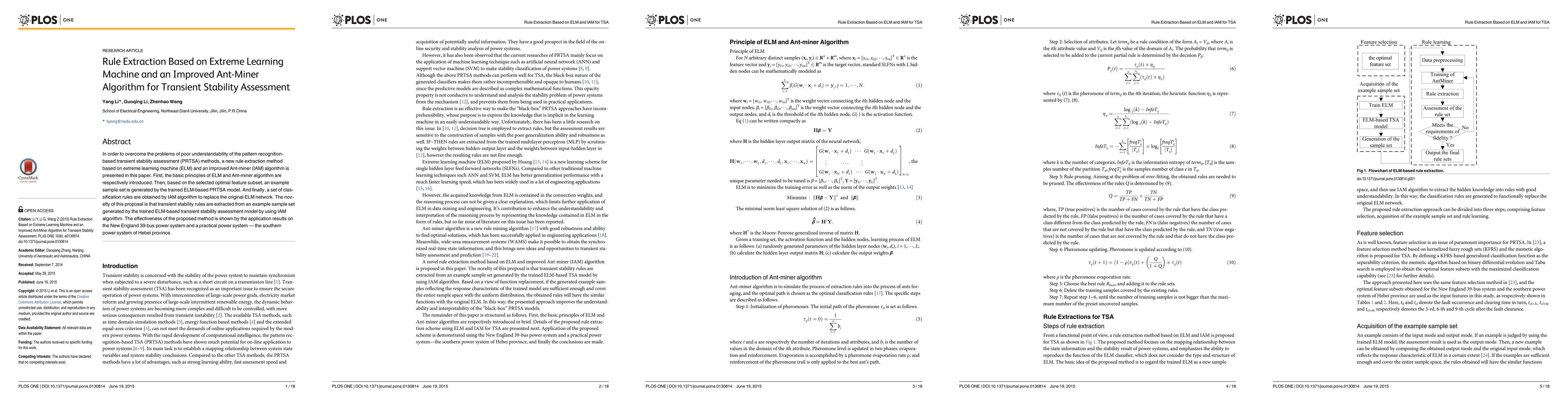 In order to overcome the problems of poor understandability of the pattern recognition-based transient stability assessment (PRTSA) methods, a new rule extraction method based on extreme learning machine (ELM) and an improved Ant-miner (IAM) algorithm is presented in this paper. First, the basic principles of ELM and Ant-miner algorithm are respectively introduced. Then, based on the selected optimal feature subset, an example sample set is generated by the trained ELM-based PRTSA model. And finally, a set of classification rules are obtained by IAM algorithm to replace the original ELM network. The novelty of this proposal is that transient stability rules are extracted from an example sample set generated by the trained ELM-based transient stability assessment model by using IAM algorithm. The effectiveness of the proposed method is shown by the application results on the New England 39-bus power system and a practical power system - the southern power system of Hebei province.