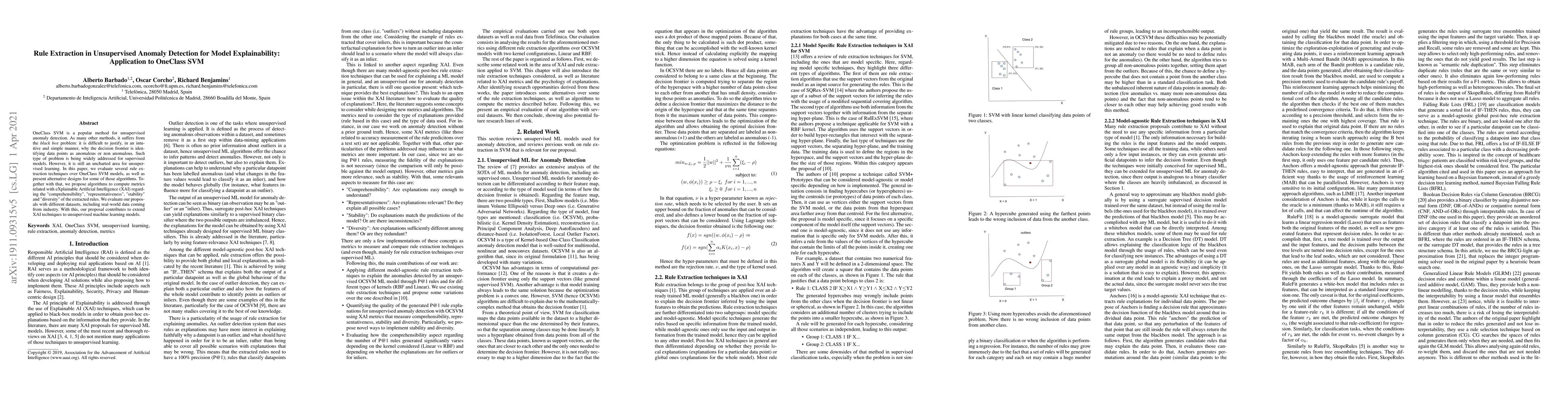OneClass SVM is a popular method for unsupervised anomaly detection. As many other methods, it suffers from the black box problem: it is difficult to justify, in an intuitive and simple manner, why the decision frontier is identifying data points as anomalous or non anomalous. Such type of problem is being widely addressed for supervised models. However, it is still an uncharted area for unsupervised learning. In this paper, we evaluate several rule extraction techniques over OneClass SVM models, as well as present alternative designs for some of those algorithms. Together with that, we propose algorithms to compute metrics related with eXplainable Artificial Intelligence (XAI) regarding the "comprehensibility", "representativeness", "stability" and "diversity" of the extracted rules. We evaluate our proposals with different datasets, including real-world data coming from industry. With this, our proposal contributes to extend XAI techniques to unsupervised machine learning models.