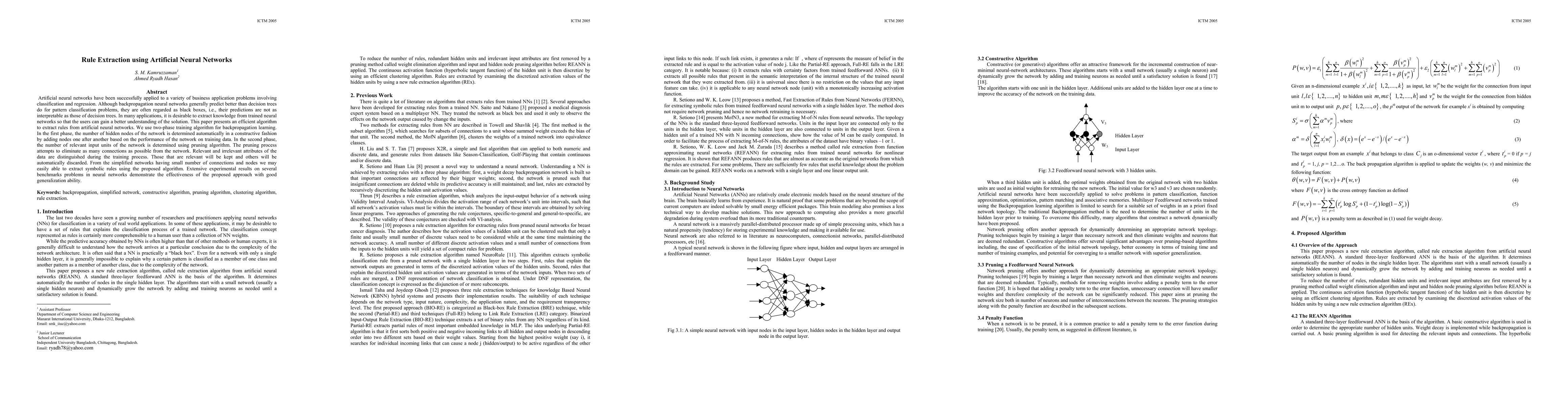 This paper proposes an efficient algorithm to extract interpretable rules from trained artificial neural networks, addressing the "black box" issue of neural networks. The method involves two-phase training: constructive determination of hidden nodes and pruning to simplify the network, followed by rule extraction from the simplified network. Experimental results show the effectiveness of the approach.