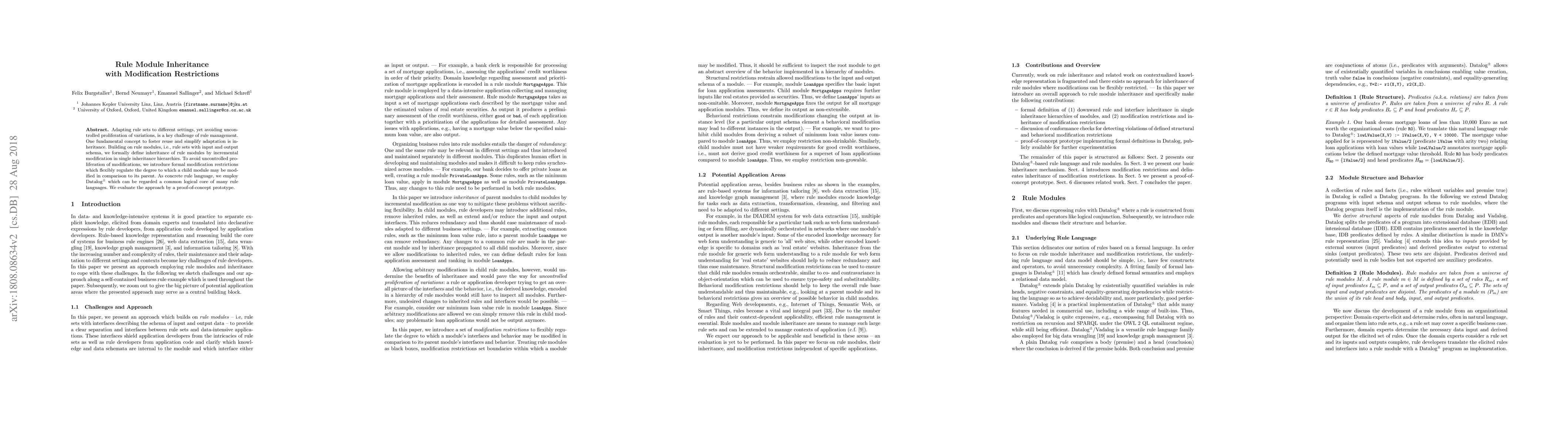 This paper presents a method for managing rule sets by adapting them using rule module inheritance with modification restrictions. It introduces formal rules to control modifications in child modules compared to parent modules, preventing uncontrolled variations. The approach is demonstrated using Datalog+/- as a concrete rule language, and its effectiveness is shown through a proof-of-concept prototype.