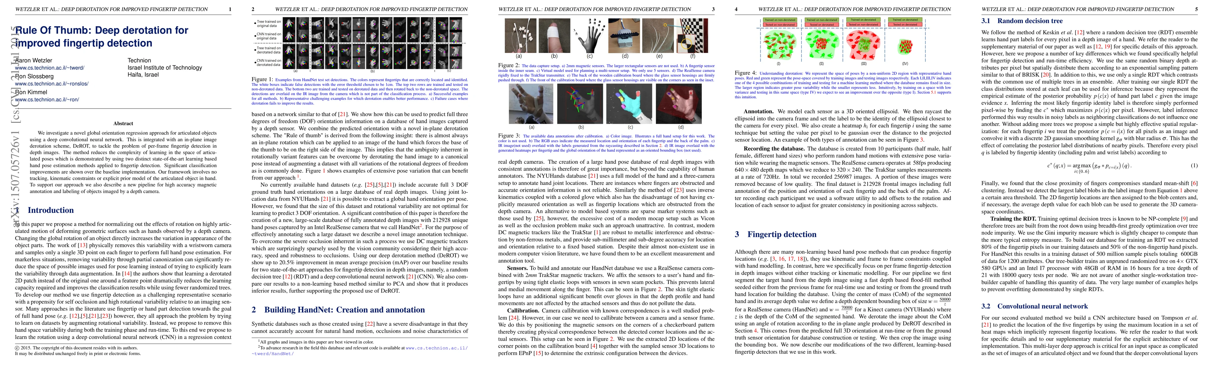 We investigate a novel global orientation regression approach for articulated objects using a deep convolutional neural network. This is integrated with an in-plane image derotation scheme, DeROT, to tackle the problem of per-frame fingertip detection in depth images. The method reduces the complexity of learning in the space of articulated poses which is demonstrated by using two distinct state-of-the-art learning based hand pose estimation methods applied to fingertip detection. Significant classification improvements are shown over the baseline implementation. Our framework involves no tracking, kinematic constraints or explicit prior model of the articulated object in hand. To support our approach we also describe a new pipeline for high accuracy magnetic annotation and labeling of objects imaged by a depth camera.
