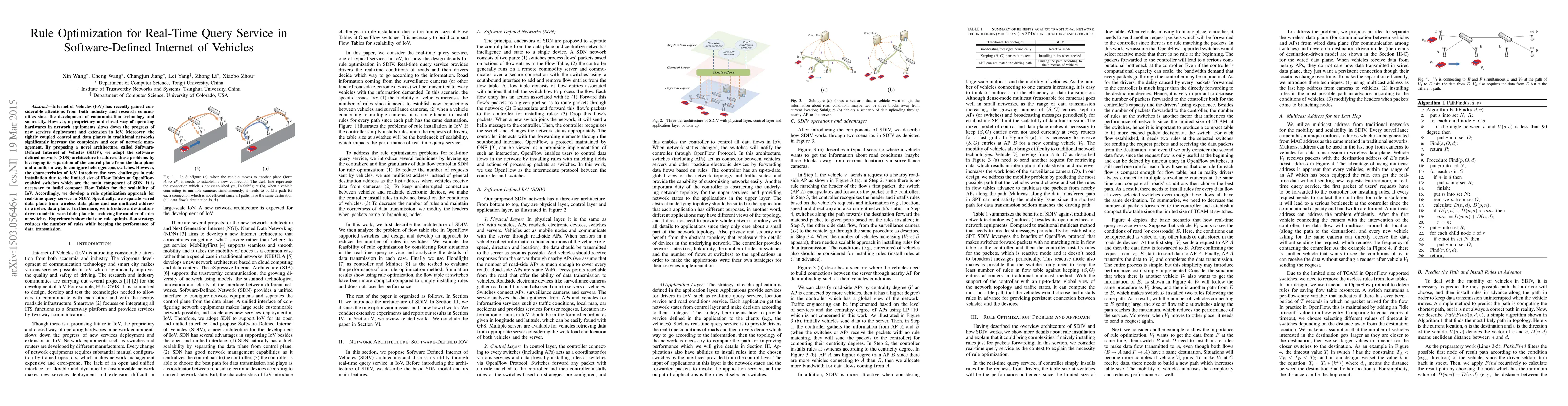 This paper proposes a novel Software-Defined Internet of Vehicles (SDIV) architecture to optimize rule installation in the context of real-time query service, addressing the challenges of limited Flow Table size in OpenFlow-enabled switches. The approach separates wired and wireless data planes and introduces a destination-driven model to reduce rules, demonstrating improved scalability and performance.