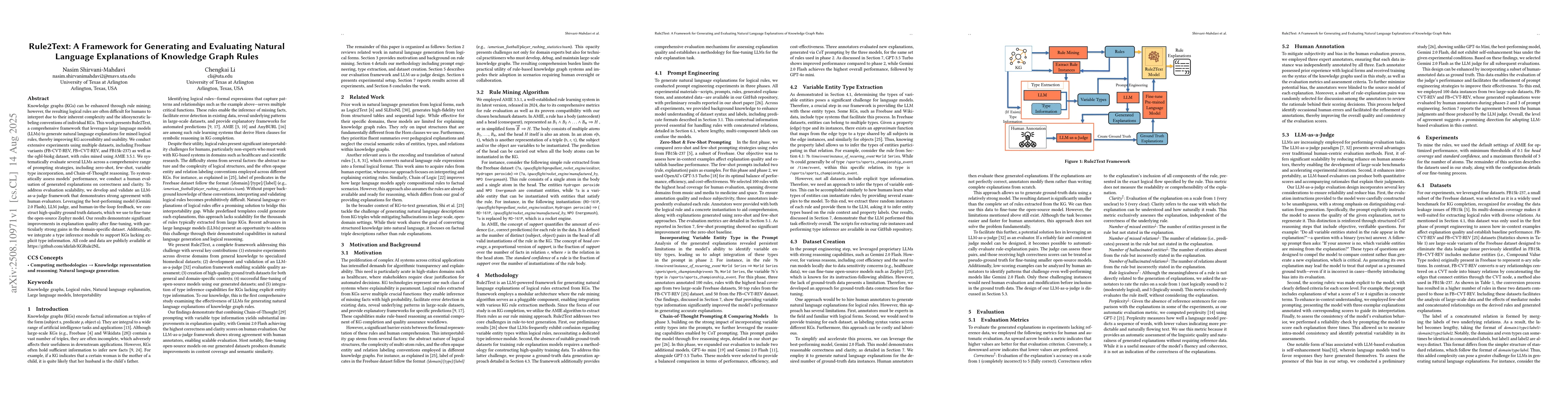 Knowledge graphs (KGs) can be enhanced through rule mining; however, the resulting logical rules are often difficult for humans to interpret due to their inherent complexity and the idiosyncratic labeling conventions of individual KGs. This work presents Rule2Text, a comprehensive framework that leverages large language models (LLMs) to generate natural language explanations for mined logical rules, thereby improving KG accessibility and usability. We conduct extensive experiments using multiple datasets, including Freebase variants (FB-CVT-REV, FB+CVT-REV, and FB15k-237) as well as the ogbl-biokg dataset, with rules mined using AMIE 3.5.1. We systematically evaluate several LLMs across a comprehensive range of prompting strategies, including zero-shot, few-shot, variable type incorporation, and Chain-of-Thought reasoning. To systematically assess models' performance, we conduct a human evaluation of generated explanations on correctness and clarity. To address evaluation scalability, we develop and validate an LLM-as-a-judge framework that demonstrates strong agreement with human evaluators. Leveraging the best-performing model (Gemini 2.0 Flash), LLM judge, and human-in-the-loop feedback, we construct high-quality ground truth datasets, which we use to fine-tune the open-source Zephyr model. Our results demonstrate significant improvements in explanation quality after fine-tuning, with particularly strong gains in the domain-specific dataset. Additionally, we integrate a type inference module to support KGs lacking explicit type information. All code and data are publicly available at https://github.com/idirlab/KGRule2NL.