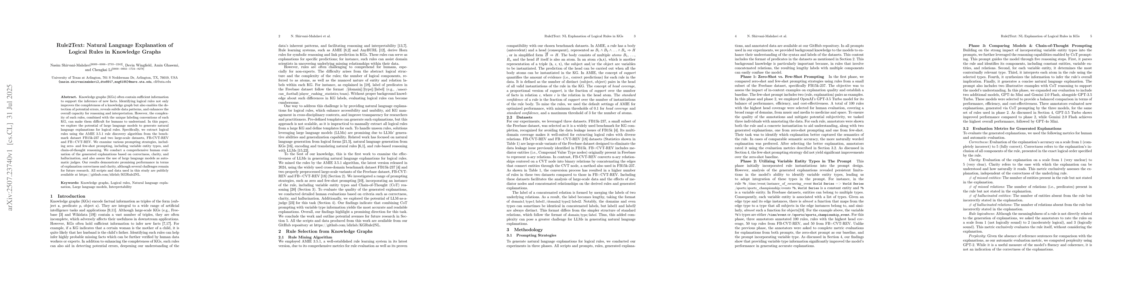 Knowledge graphs (KGs) often contain sufficient information to support the inference of new facts. Identifying logical rules not only improves the completeness of a knowledge graph but also enables the detection of potential errors, reveals subtle data patterns, and enhances the overall capacity for reasoning and interpretation. However, the complexity of such rules, combined with the unique labeling conventions of each KG, can make them difficult for humans to understand. In this paper, we explore the potential of large language models to generate natural language explanations for logical rules. Specifically, we extract logical rules using the AMIE 3.5.1 rule discovery algorithm from the benchmark dataset FB15k-237 and two large-scale datasets, FB-CVT-REV and FB+CVT-REV. We examine various prompting strategies, including zero- and few-shot prompting, including variable entity types, and chain-of-thought reasoning. We conduct a comprehensive human evaluation of the generated explanations based on correctness, clarity, and hallucination, and also assess the use of large language models as automatic judges. Our results demonstrate promising performance in terms of explanation correctness and clarity, although several challenges remain for future research. All scripts and data used in this study are publicly available at https://github.com/idirlab/KGRule2NL}{https://github.com/idirlab/KGRule2NL.