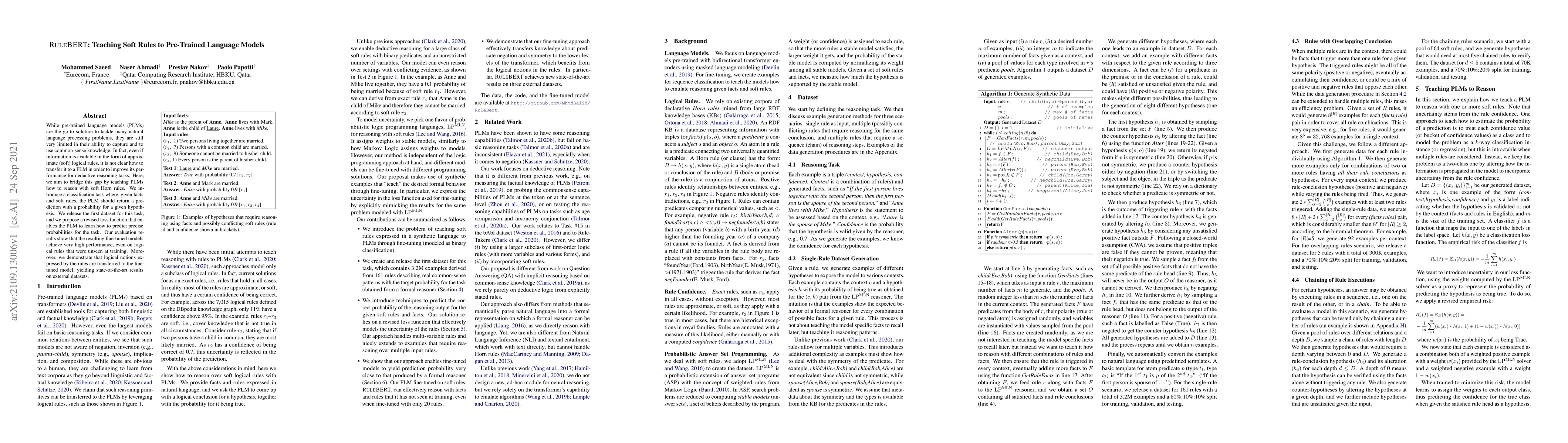 The paper introduces RuleBert, a method to teach pre-trained language models to reason using soft Horn rules through a classification task, achieving high performance and transferring logical knowledge, resulting in state-of-the-art results on external datasets.