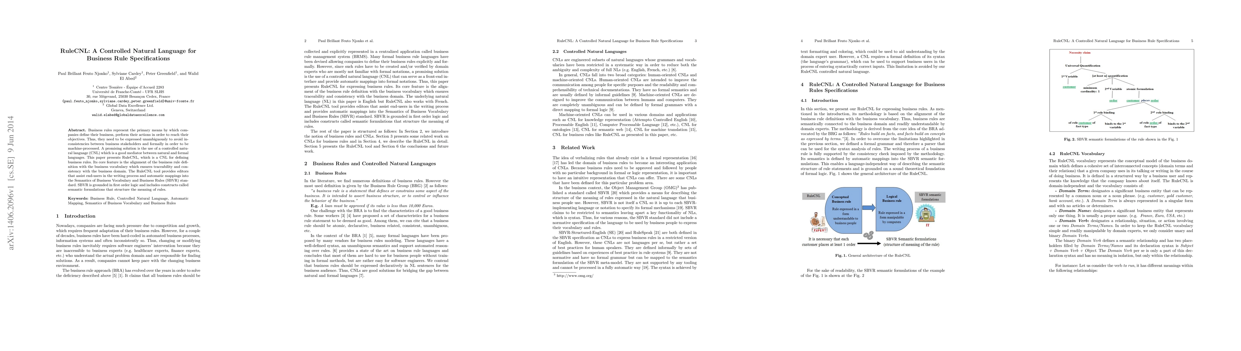 This paper introduces RuleCNL, a controlled natural language designed for unambiguous business rule specification, aligning business vocabulary with rule definitions for traceability and consistency. The RuleCNL tool aids in writing and automatically maps rules to the Semantics of Business Vocabulary and Business Rules (SBVR) standard.