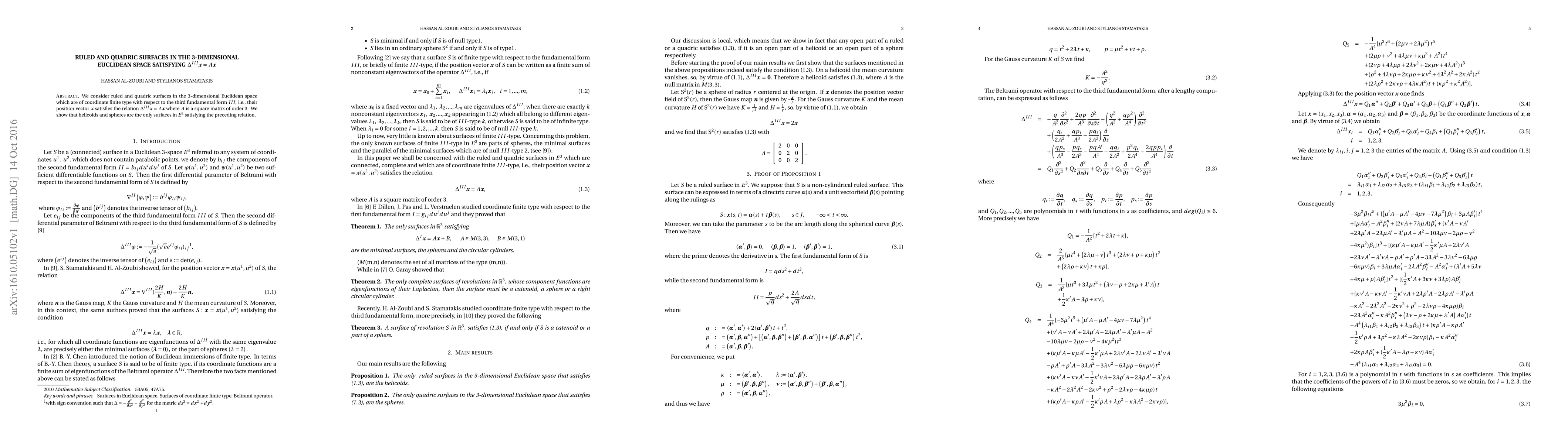 This research paper identifies helicoids and spheres as the only ruled and quadric surfaces in 3D Euclidean space satisfying a specific matrix relation, showcasing their unique properties.