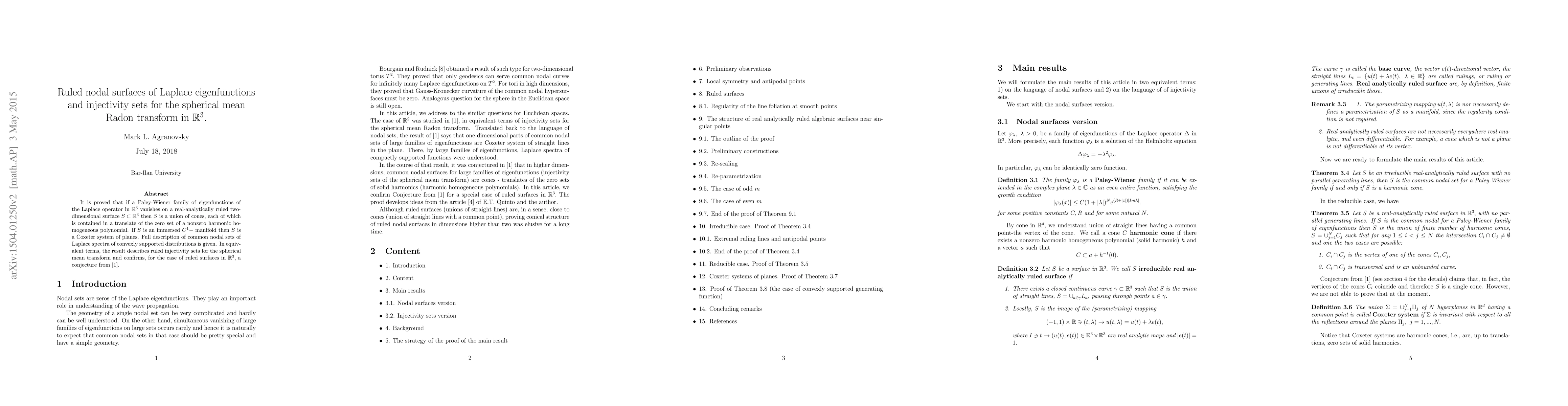 It is proved that if a Paley-Wiener family of eigenfunctions of the Laplace operator in $\mathbb R^3$ vanishes on a real analytically ruled two-dimensional surface $S \subset \mathbb R^3$ then $S$ is a union of cones, each of which is contained in a translate of the zero set of a nonzero harmonic homogeneous polynomial. If $S$ is an immersed $C^1-$ manifold then $S$ is a Coxeter system of planes. Full description of common nodal sets of the Laplace spectra of convexly supported distributions is given. In equivalent terms, the result describes ruled injectivity sets for the spherical mean transform and confirms, for the case of ruled surfaces in $\mathbb R^3,$ a conjecture of E.T. Quinto and the author .