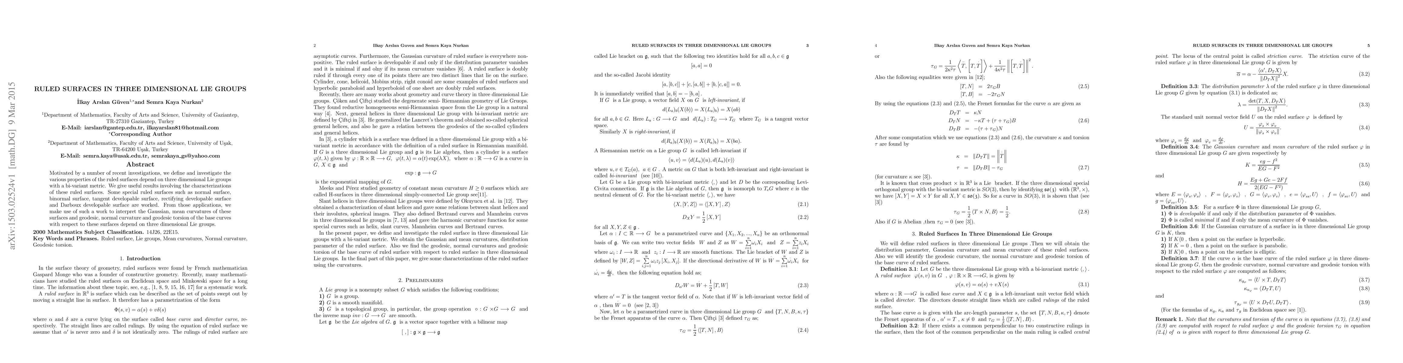 Motivated by a number of recent investigations, we define and investigate the various properties of the ruled surfaces depend on three dimensional Lie groups with a bi-variant metric. We give useful results involving the characterizations of these ruled surfaces. Some special ruled surfaces such as normal surface, binormal surface, tangent developable surface, rectifying developable surface and Darboux developable surface are worked. From those applications, we make use of such a work to interpret the Gaussian, mean curvatures of these surfaces and geodesic, normal curvature and geodesic torsion of the base curves with respect to these surfaces depend on three dimensional Lie groups.