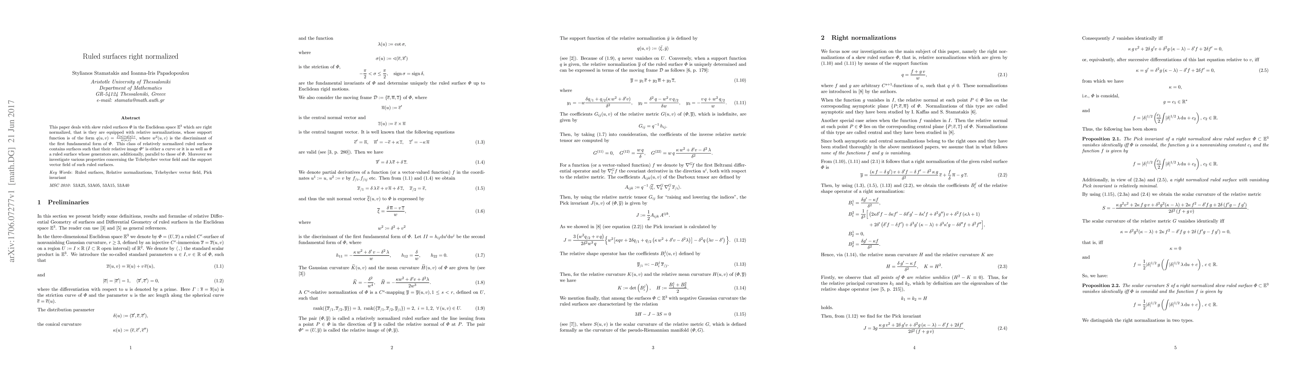 This paper deals with skew ruled surfaces $\varPhi$ in the Euclidean space $\mathbb{E}^{3}$ which are right normalized, that is they are equipped with relative normalizations, whose support function is of the form $q(u,v) = \frac{f(u) + g(u)\, v}{w(u,v)}$, where $w^2(u,v)$ is the discriminant of the first fundamental form of $\varPhi$. This class of relatively normalized ruled surfaces contains surfaces such that their relative image $\varPhi^{*}$ is either a curve or it is as well as $\varPhi$ a ruled surface whose generators are, additionally, parallel to those of $\varPhi$. Moreover we investigate various properties concerning the Tchebychev vector field and the support vector field of such ruled surfaces.