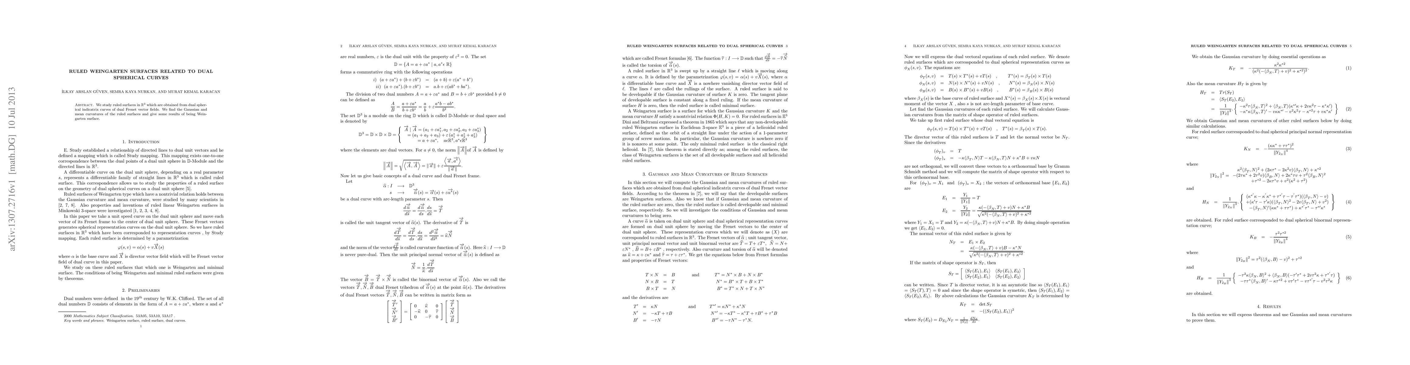 The research extends previous work on ruled Weingarten surfaces by examining their relationship with dual spherical curves and providing specific conditions for them to be Weingarten and minimal surfaces.