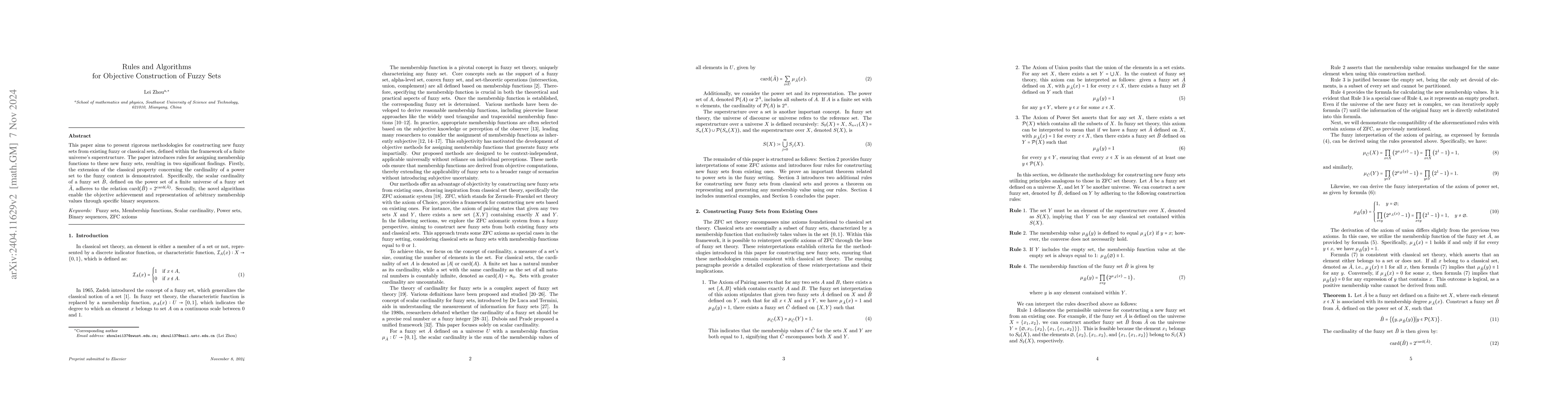 This paper aims to present objective methods for constructing new fuzzy sets from known fuzzy or classical sets, defined over the elements of a finite universe's superstructure. The paper proposes rules for assigning membership functions to these new fuzzy sets, leading to two important findings. Firstly, the property concerning the cardinality of a power set in classical theory has been extended to the fuzzy setting, whereby the scalar cardinality of a fuzzy set $\tilde B$ defined on the power set of a finite universe of a fuzzy set $\tilde A$ satisfies $\text{card}(\tilde B)=2^{\text{card}(\tilde A)}$. Secondly, the novel algorithms allow for an arbitrary membership value to be objectively achieved and represented by a specific binary sequence.